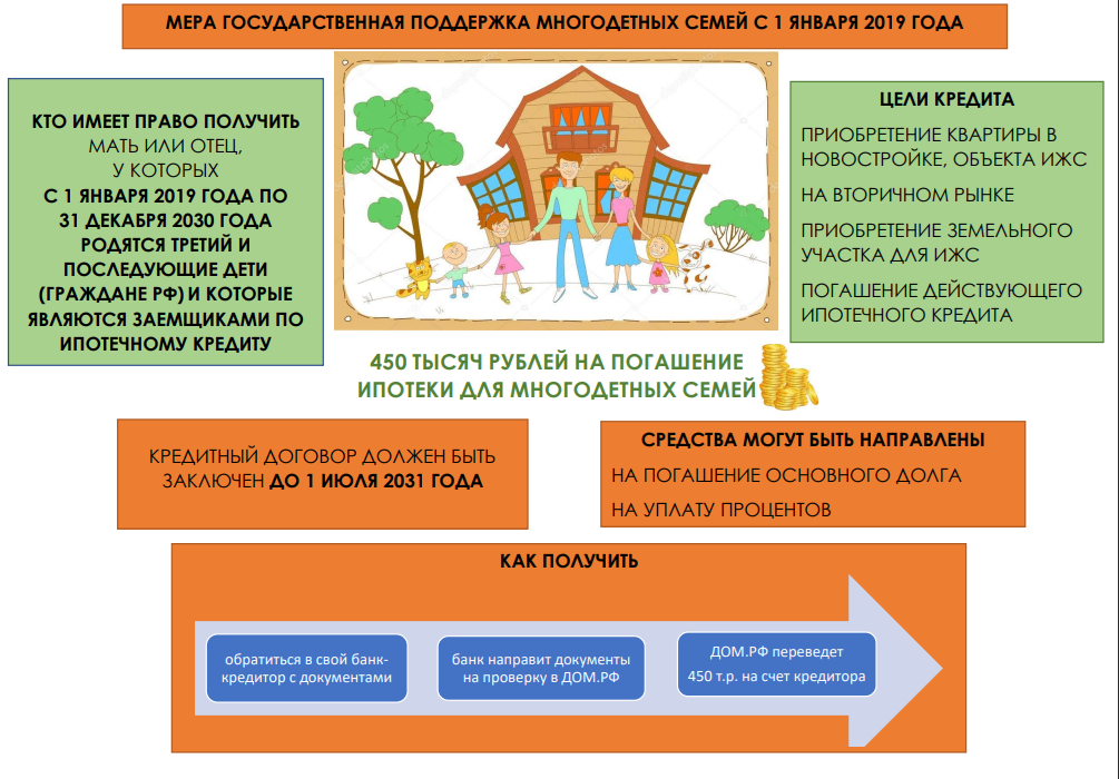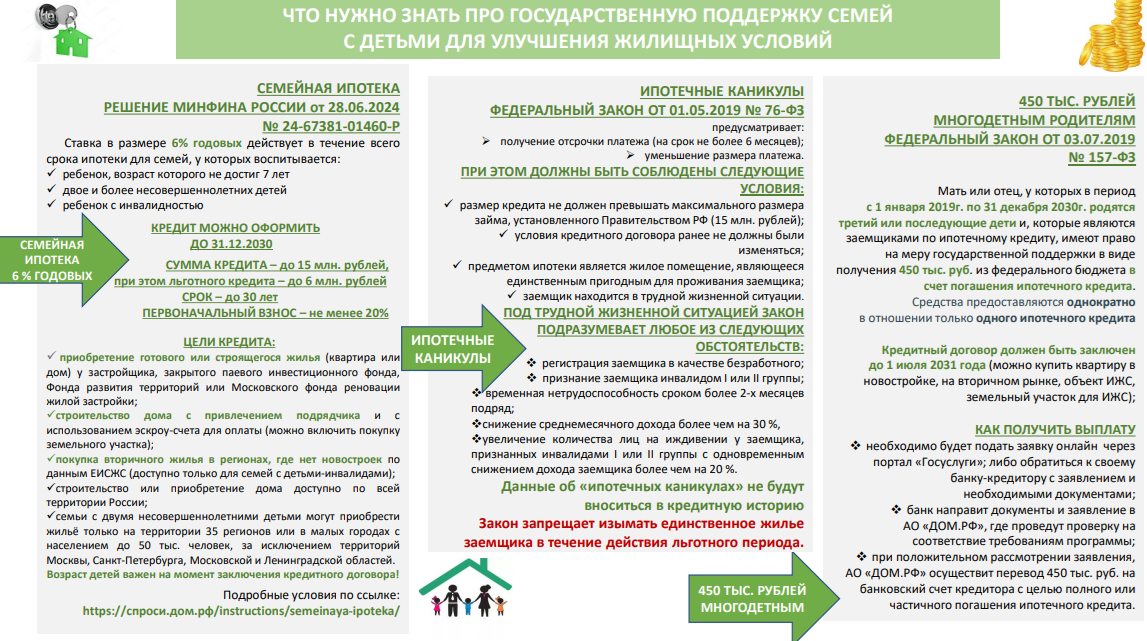 Для оказания помощи семьям с детьми в приобретении собственного жилья реализуются государственные и региональные меры поддержки, запускаются государственные программы поддержки ипотечного кредитования, а также расширяется спектр ипотечных программ, предлагаемых кредитными организациями.