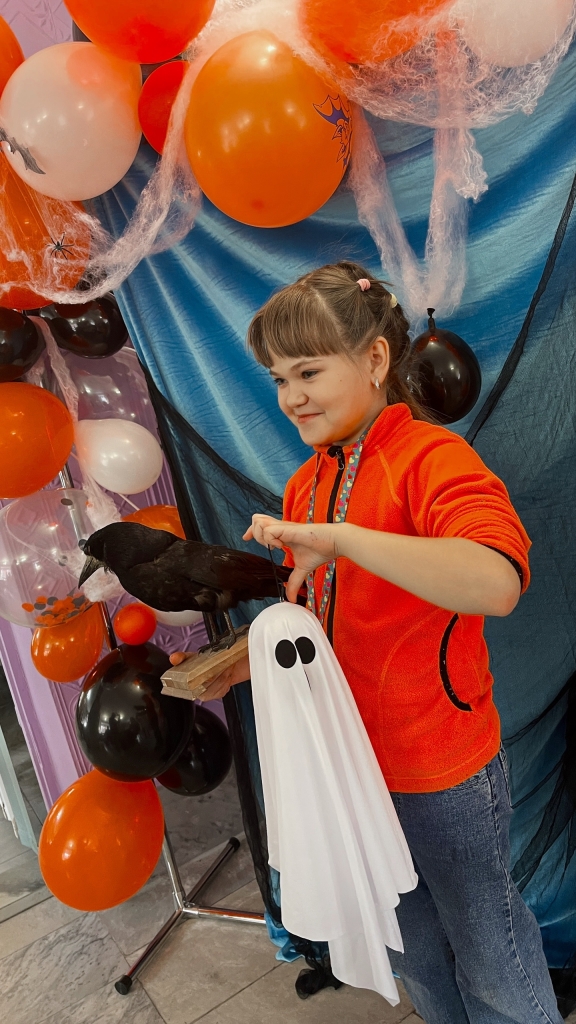 Персонажей наших гостей встречали верные хранители волшебного уголка: загадочный Ворон Аркадий, улыбчивая Тыква Джек, причудливая паутина с пауками и мерцающие шары.