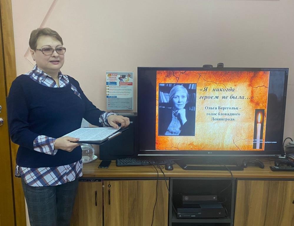«Мадонна блокадного Ленинграда» – так назывался литературный час, посвящённый Дню полного снятия блокады Ленинграда и 115-летию Ольги Берггольц. Пенсионеры дневного пребывания Комплексного центра социального обслуживания населения узнали о том, что Ольга Фёдоровна вошла в историю русской литературы, как поэт ленинградской блокады, при этом прочие обстоятельства её трагической жизни до сих пор остаются для широкой публики практически неизвестными. В 1938 году она была репрессирована, в годы Великой Отечественной войны оставалась в осаждённом Ленинграде – работала на радио. Её лучшие поэтические произведения, посвящённые защитникам Ленинграда: «Февральский дневник» и «Ленинградская поэма». О. Берггольц – автор крылатой строки, ставшей лозунгом, высеченным на Мемориальной стене Пискарёвского кладбища, где похоронены многие жертвы Ленинградской блокады: «Никто не забыт, ничто не забыто».