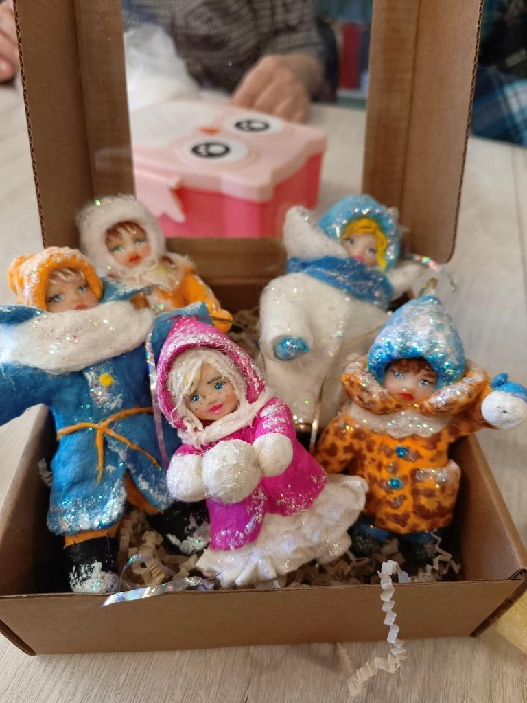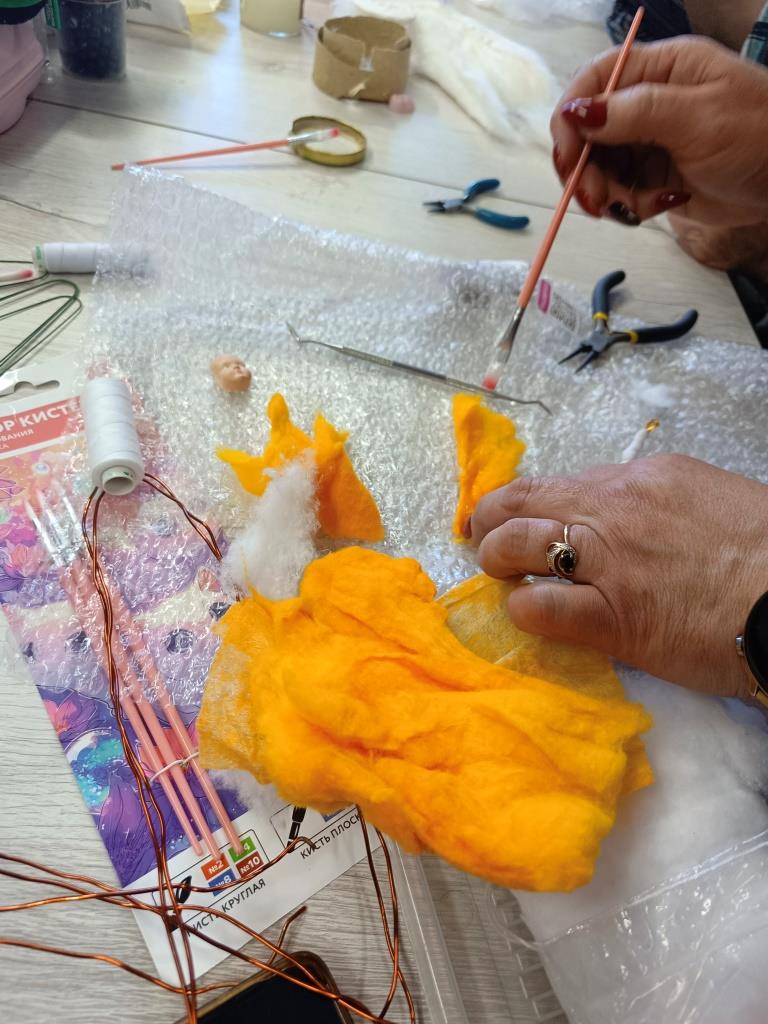 Каждая ватная игрушка проходит несколько этапов создания: формирование каркаса из проволоки, послойное наложение ваты с клейстером, сушка, роспись акриловыми красками и финальное покрытие. Своим мастерством поделилась с присутствующими Эльвира Викторовна Бажева. Наши рукодельницы вложили в каждую игрушку частичку своего тепла, внимательно повторяя за опытным мастером каждое движение, но при этом не забывая об индивидуальности. Поэтому каждая игрушка в итоге получилась уникальной. Она отражает не только видение мастера, но и его настроение.