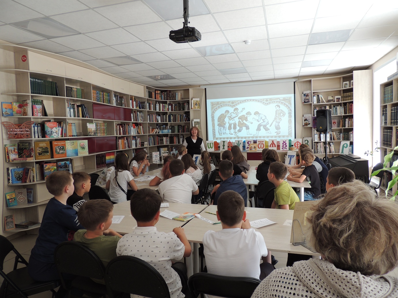 Встреча в стенах библиотеки состоялась в форме уроков в древнерусской школе и называлась «В старину учились дети». Ребята стали учениками уроков азбуки, математики, словесности. Дети удивились, что в азбуке было 49 букв, затем 46 и сегодня мы имеем 33 буквы алфавита, а в математике цифры обозначались буквами. Урок же словесности стал для ребят уроком нравственности, в основе которого священное писание. Этот урок библиотекарь провёл на примере произведения Л.Н. Толстого «У Васи было четыре копейки». Дети активно участвовали во всех заданиях, предложенных библиотекарем. Весёлая переменка наполнилась считалочками, загадками и игрой «Колечко».