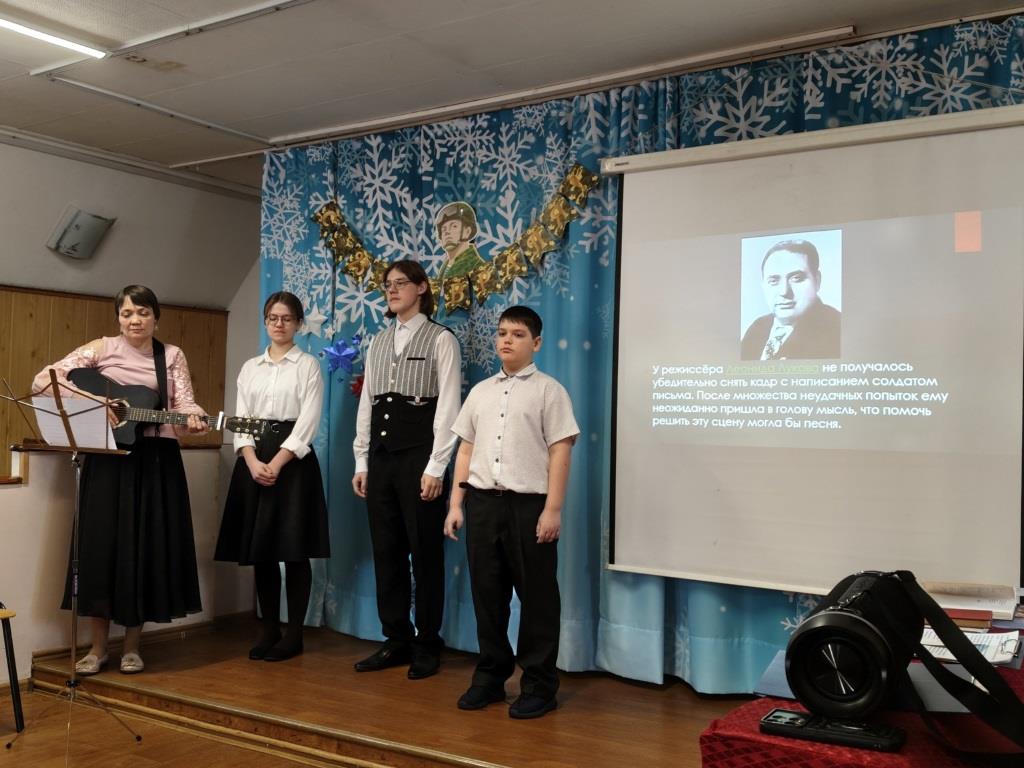 Дети представили исследовательские работы о песне военных лет, которые они получены заранее, рассказав историю создания. На встрече звучало живое исполнение песен под гитару, были показаны фрагменты из художественных и документальных фильмов. Никто не остался равнодушным – знакомые с детства песни не только пели всем залом, но и со слезами на глазах переживали события тех времен.