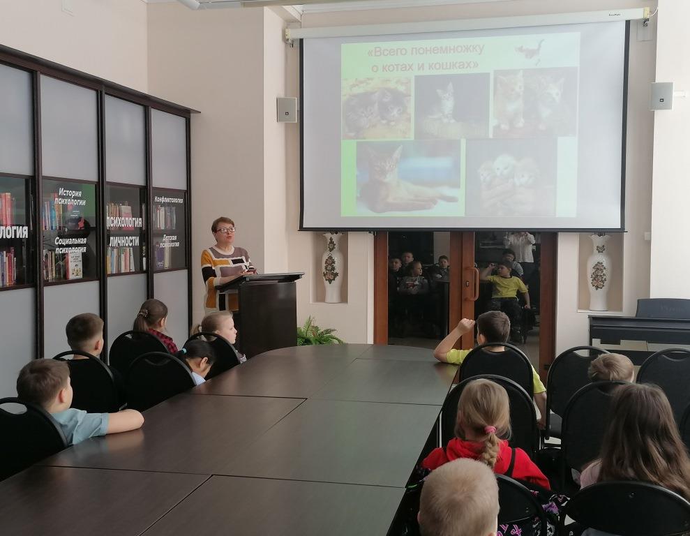 Учащиеся вторых классов узнали, как относились к кошкам в разных странах мира в разные времена, как приручили кошек, какие у них повадки и особенности. Ребятам рассказали, какую пользу приносят эти домашние животные, познакомили с разными породами кошек, с их повадками и поведением. Во время игры-викторины «Всё о наших любимых кошках» дети вспомнили лучшие художественные произведения о пушистых мурлыках, проявили свои знания в вопросах о диких кошках. Активно рассказывали о своих домашних питомцах и посмотрели мультфильм «Котёнок по имени Гав».
