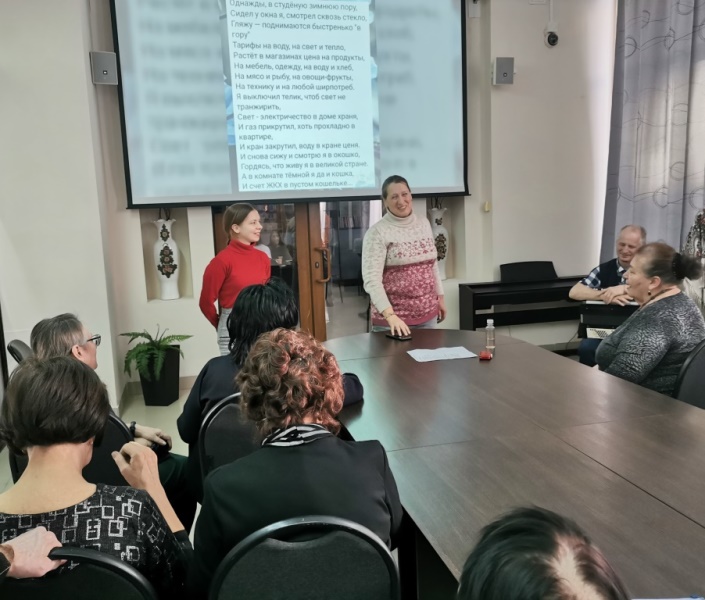 Участники литературно-поэтических клубов нашего города читали свои стихи, посвящённые зиме и зимним праздникам. Руководитель клуба «Гармония» Фролова Елена Платоновна знакомила любителей поэзии нашего города и со своим творчеством. О зимнем времени года звучали песни в исполнении участников клуба авторской песни «БАРДреченск» под руководством Ольги Демаковой.