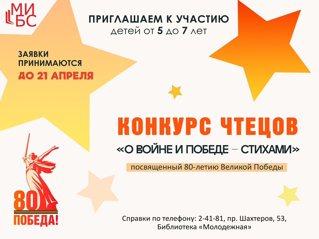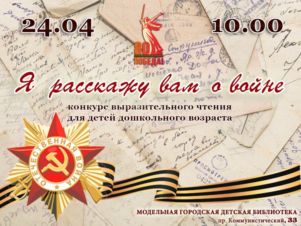 24 апреля в 10:00 в Модельной городской детской библиотеке состоится конкурс выразительного чтения стихов «Я расскажу вам о войне» среди детей дошкольного возраста, который посвящен 80-летию Победы в Великой Отечественной войне.