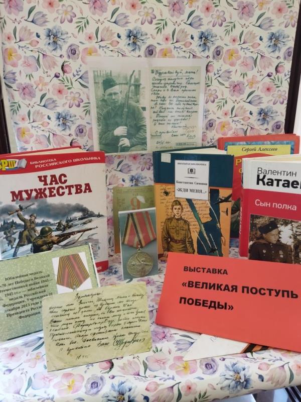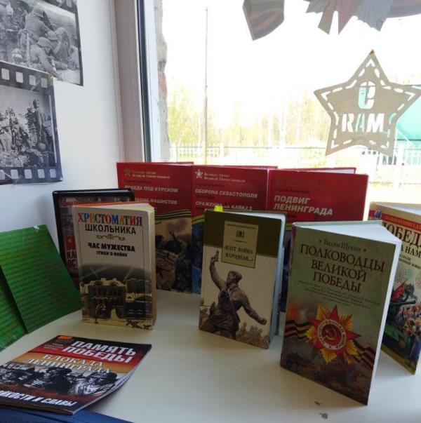 Книжная выставка «Великая поступь Победы», посвященная Дню Победы в Великой Отечественной войне, работает в Библиотечном информационно-досуговом центе поселка Чебал-Су.