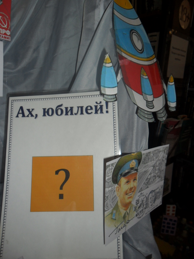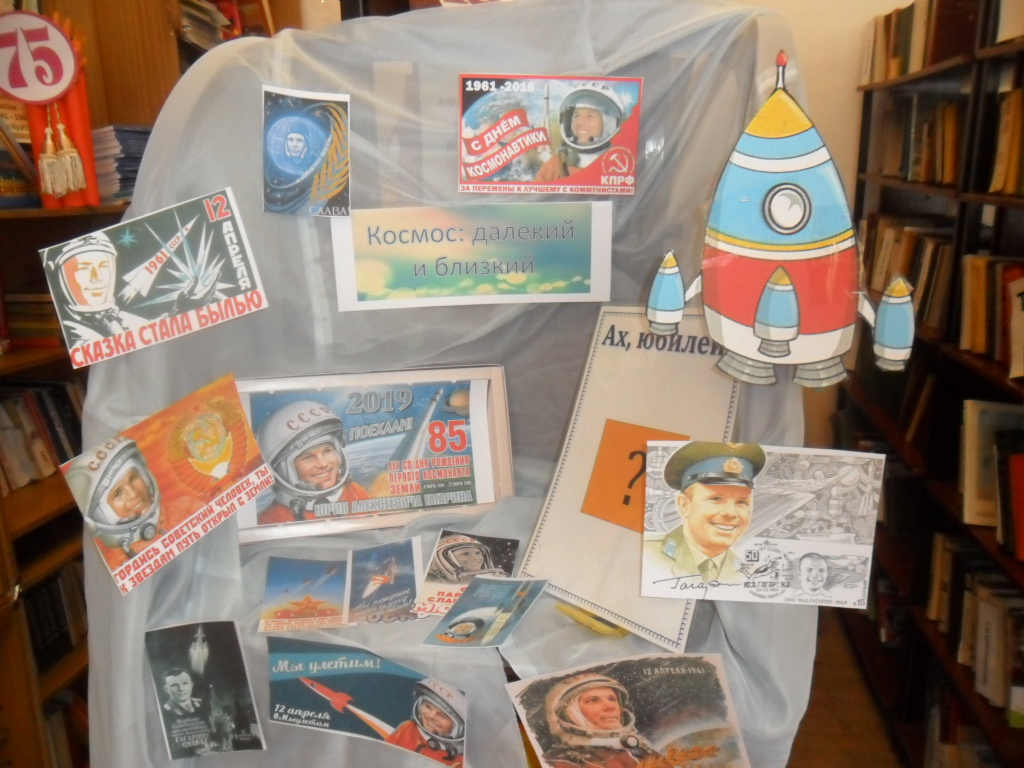 Мы предлагаем нашим посетителям посмотреть открытки, посвященные первому космонавту, фрагменты из фильмов о нем.