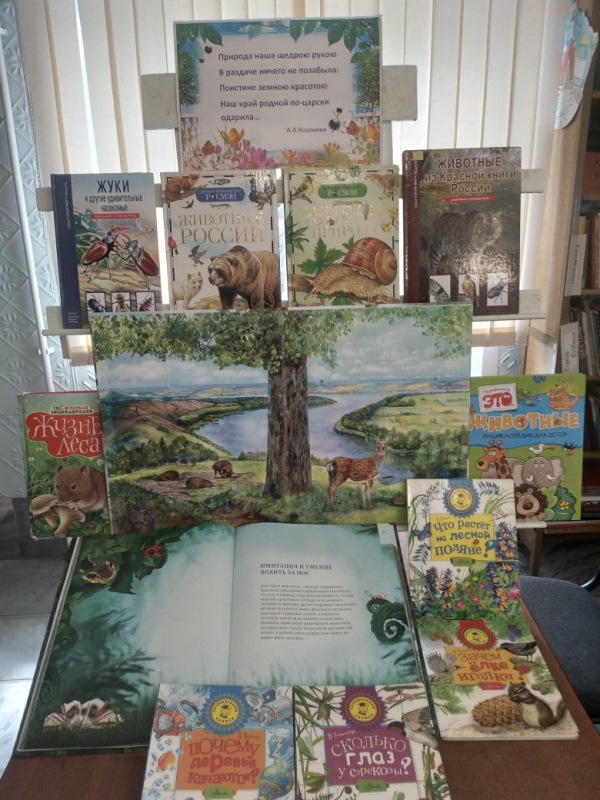Экологическая книжная выставка, посвященная лесу, а именно деревьям, растениям и животным оформлена в читальном зале библиотеки «Дружная семейка».