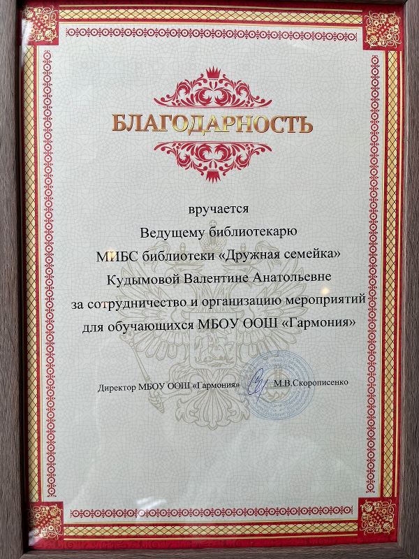 Директором МБОУ ООШ «Гармония» была вручена Благодарность ведущему библиотекарю МБУК «МИБС» библиотека «Дружная семейка» Кудымовой В.А. за сотрудничество и организацию мероприятий.