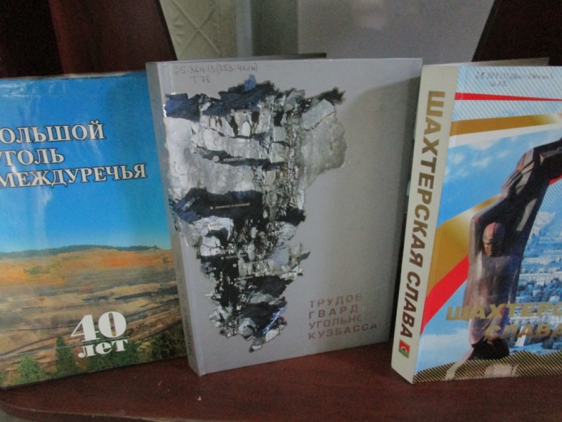 На выставке предложена подборка книг о трудовых коллективах города и истории угольной промышленности, литературные сборники.