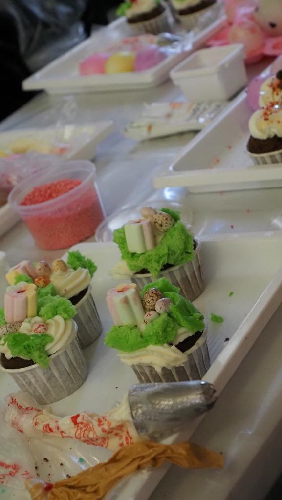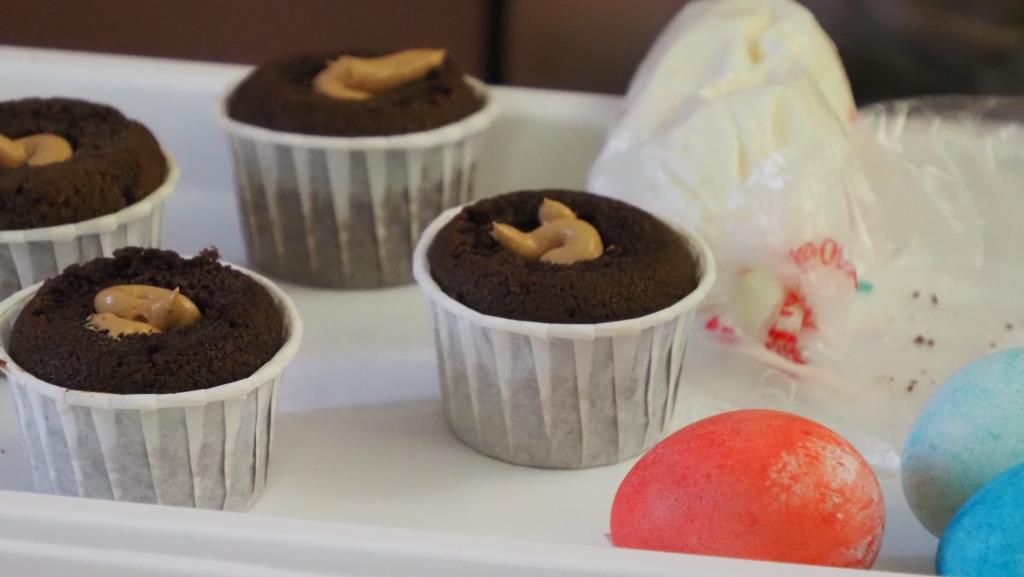 Совместно с детьми мастер-кондитер Юлия Черепанова оформила набор капкейков из 4 штук в стиле Светлого праздника, также все участники мастер-класса окрасили яйца по интересной методике: с помощью риса и пищевых красителей.