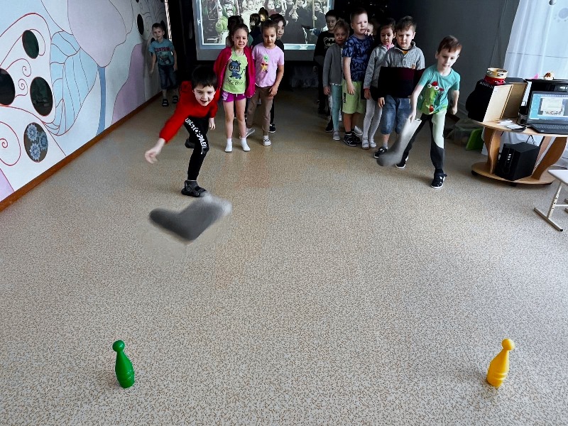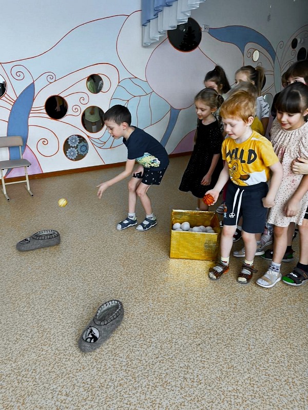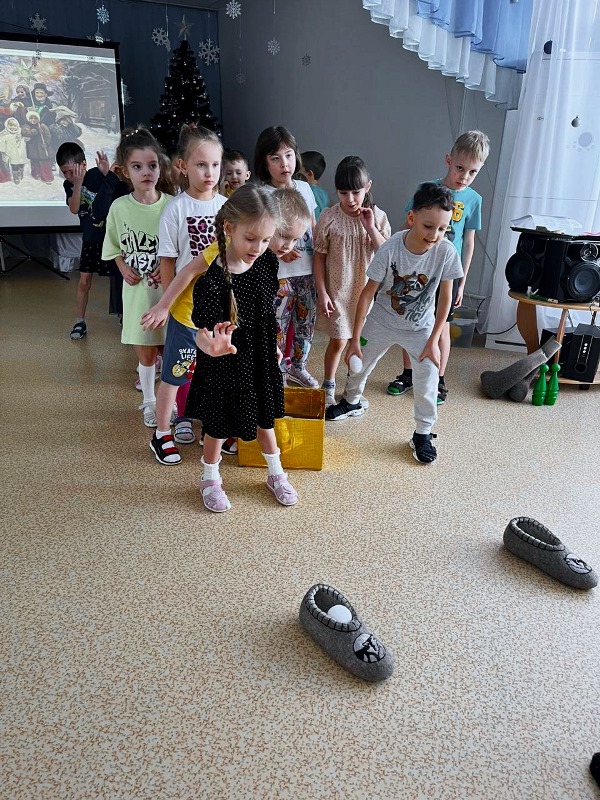 Дети активно отвечали на загадки, пели святочные частушки, играли в бубны, дудочки и свиристели, создавая праздничный оркестр. В подвижных играх девчонки и мальчишки кидали валенки на короткую и длинную дистанции, сбивали кегли и закидывали шарики в войлочные колоши.