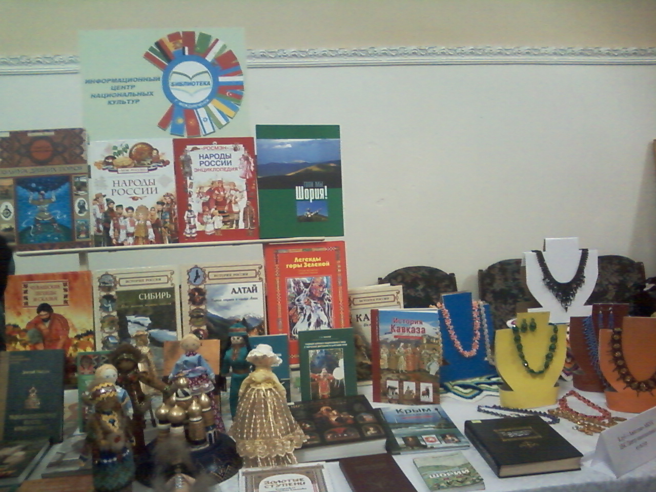 Библиотека «Центр национальных культур» представила на своей выставке книги национальных авторов народов, проживающих в нашем городе, книги об истории регионов России, о традициях и обычаях разных народов. Украшением выставки, конечно же, стала композиция из кукол, представляющих разные национальности.Литературная студия «Полифон» познакомили участников фестиваля с произведениями поэзии и прозы междуреченских поэтов и писателей. У выставки было многолюдно, живой интерес вызывали выпуски литературного альманаха «Полифон», что способствовало общению присутствующих.