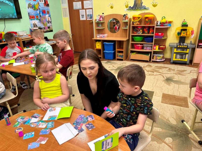 Дошколята познакомились с «анатомией» книги. Узнали, что у каждой книги есть название, автор, сюжет, главные и второстепенные герои, что она состоит из обложки, страниц, текста и иллюстраций. А еще существуют специальные книги – виммельбухи, в которых нет или почти нет текста, зато очень много картинок. Листая их, читатель может сам придумывать увлекательные истории о героях иллюстраций и даже целые миры. Один из самых больших плюсов таких книг в том, что они пробуждают интерес к знаниям, развивают речь и воображение. Именно такие книжки ребята постарались сделать своими руками при помощи заготовленной основы, клея и картинок, посвященных самым актуальным темам: семье, ведь 2024 год объявлен Годом семьи, и приближающемуся празднику – Дню космонавтики.