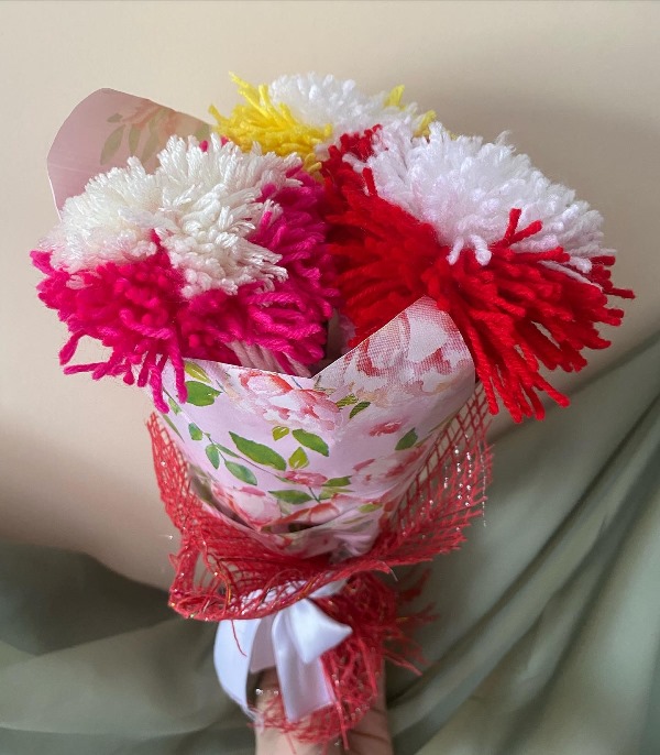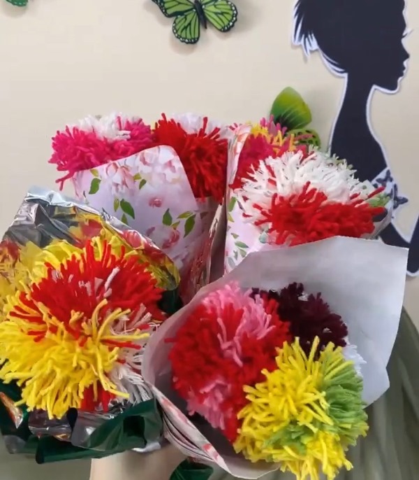 Для любимых мам, бабушек, сестер участники мастер-класса создали необычные, яркие и красивые букеты собственными руками всего лишь при помощи пряжи, деревянных палочек и упаковочной бумаги.