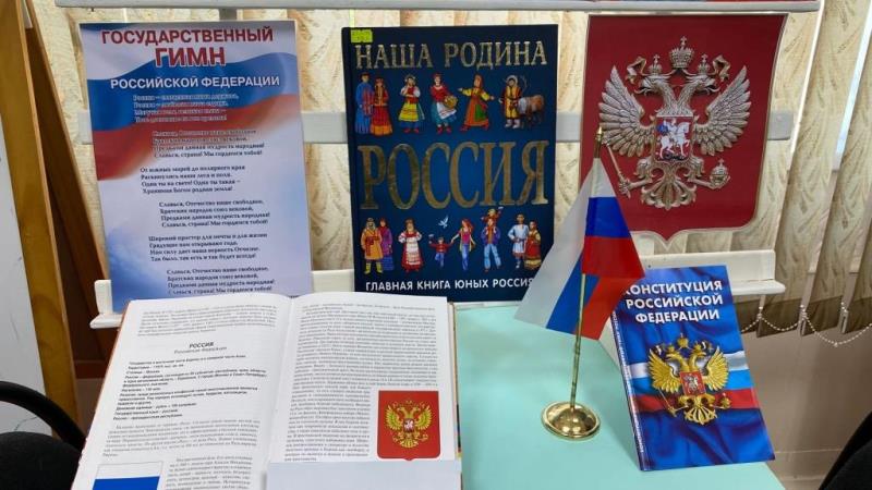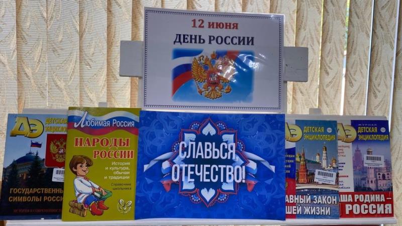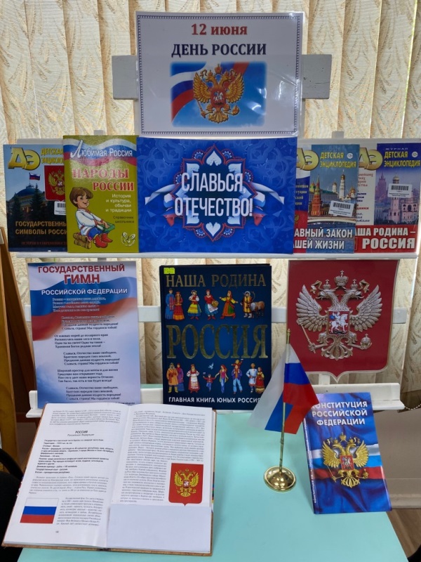 К празднику в библиотеке была оформлена книжная выставка «Славься, Отечество!», на которой демонстрировались издания, рассказывающие о современной России, о государственных символах, народах, их традициях и обычаях, о природе и ее ресурсах.