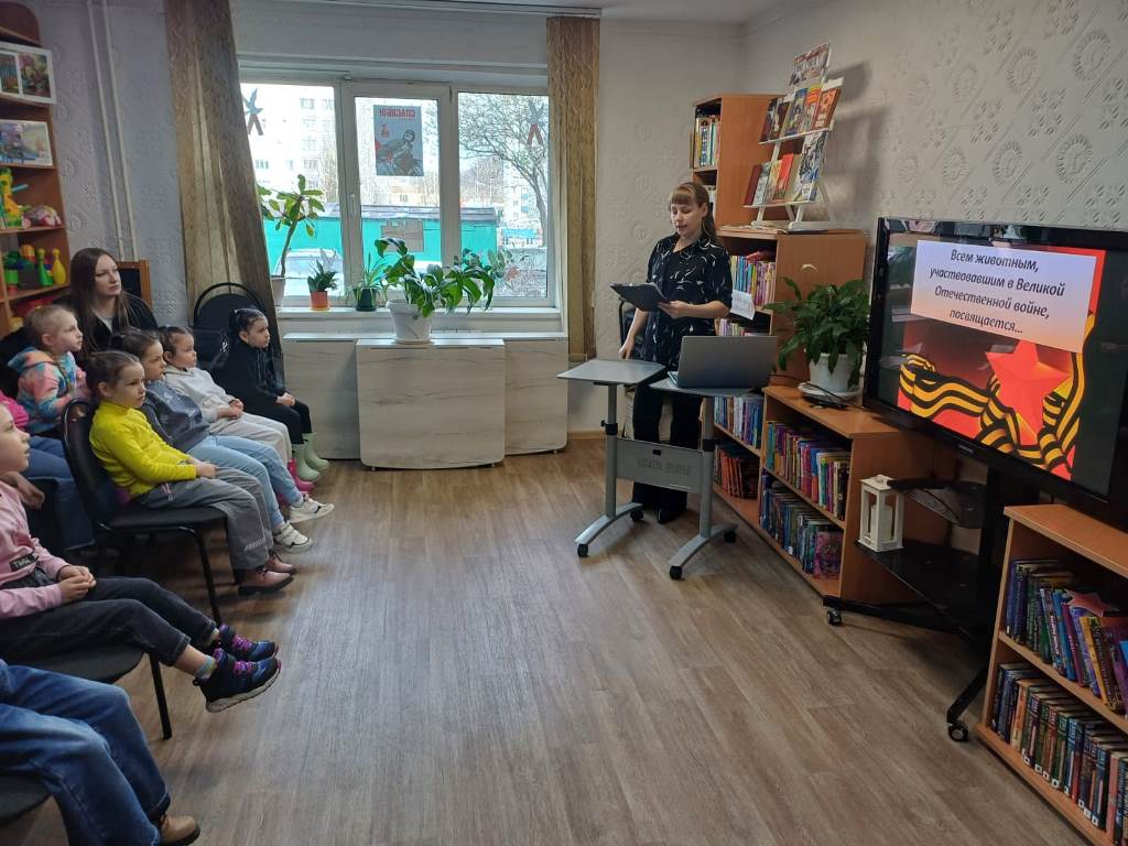 24 апреля в библиотеке «Молодёжная» библиотекари провели исторический час о Великой Отечественной Войне для детского сада №45 «Добрая фея», а именно «Животные – герои Великой Отечественной войны».