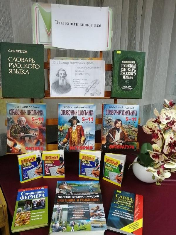 Книжная выставка «Эти книги знают все» знакомит читателей с многообразием словарно-энциклопедического книжного мира, представит востребованные издания: «Толковый словарь» гения русской словесности В. Даля, «Словарь русского языка» С.И. Ожегова, популярные энциклопедические издания по различным отраслям знаний, справочники для школьников по различным предметам.