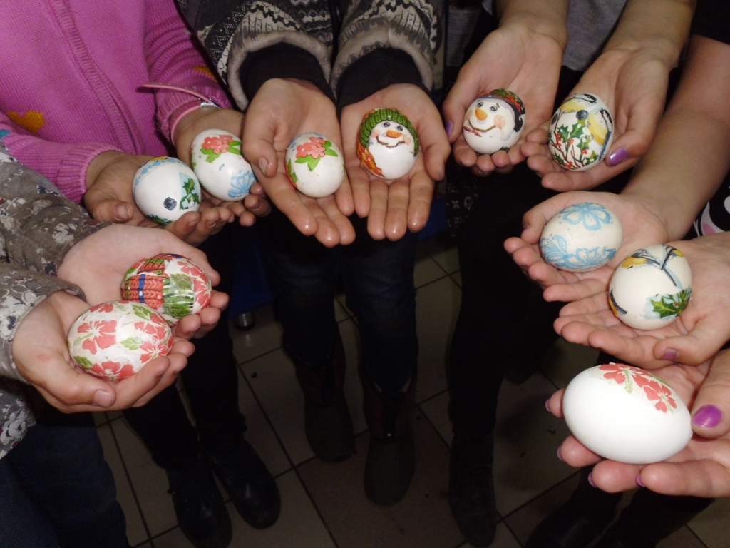 Детям было предложено использовать технику декупажа. Декупаж – это техника декорирования предметов, которая основывается на вырезании и приклеивании рисунка. Вот что получилось.