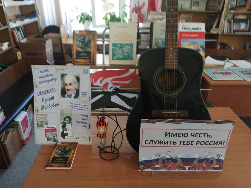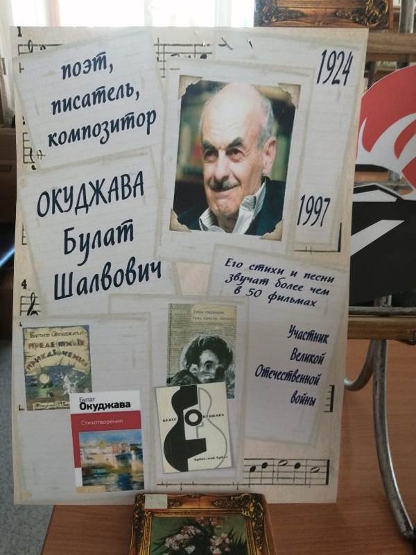 9 мая 2024 года исполняется 100 лет со дня рождения одного из самых значимых поэтов – бардов ХХ века Булата Шавловича Окуджавы. Цель выставки познакомить посетителей библиотеки с биографией и творчеством поэта, а также стихотворениями автора о войне. На свои стихи талантливый поэт писал музыку и сам исполнял свои песни. Его творчество вместило целую эпоху. Судьба поэта – это судьба целого поколения. Он добровольцем ушел на фронт, и война навсегда осталась в его жизни и творчестве. Барда уже давно нет в живых, а его песни и стихи можно услышать из передач, концертов, фильмов, показанных по телевиденью. Эти строчки, которые дарят нам веру в любовь, надежду, друзей. А еще в Победу…