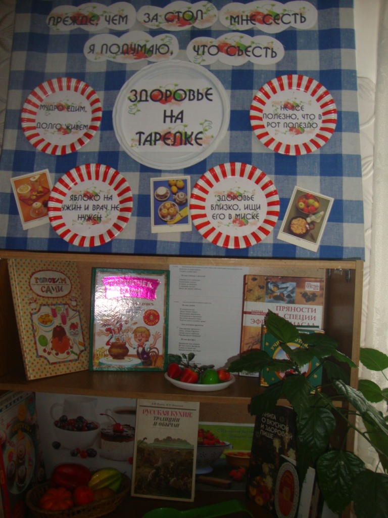 На выставке представлены книги о правилах поведения за столом, о правильном питании, о роли полезных продуктов на здоровье человека, а так же рецепты о вкусной и здоровой пище.