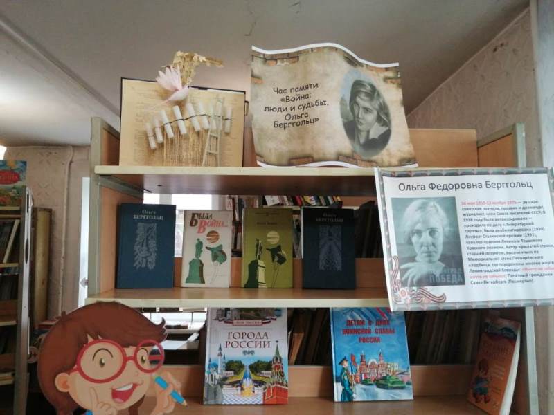 В библиотеке «Семейного чтения» к юбилею Ольги Берггольц представлена книжная выставка-память «Война: люди и судьбы». На выставке представлены стихи поэта, которые являются живым голосом очевидцев. Они помогают понять то суровое время, когда благодаря мужеству советского народа Ленинград выстоял, а стихи Ольги Берггольц и сегодня звучат актуально о стойкости духа России.