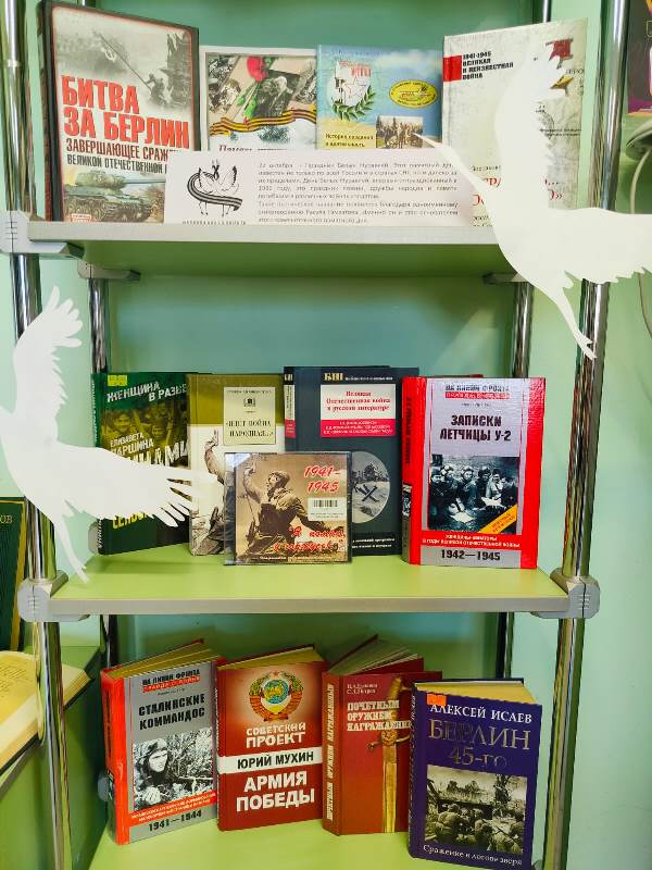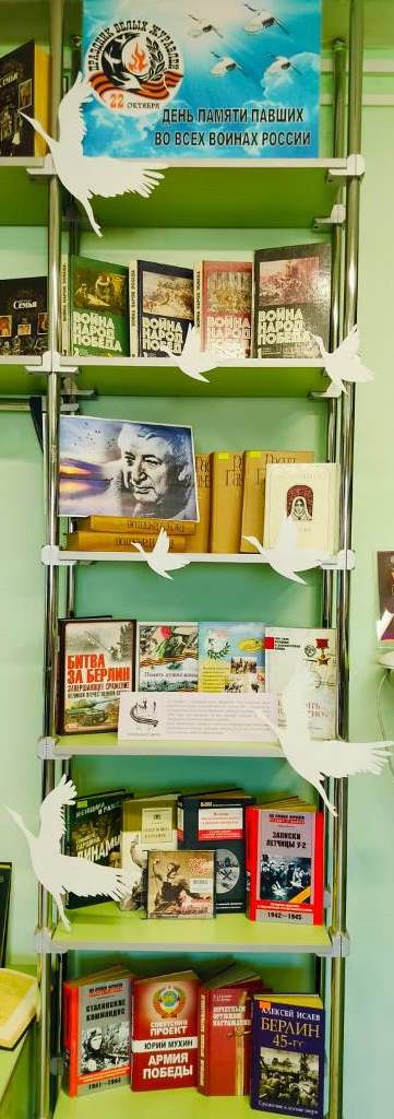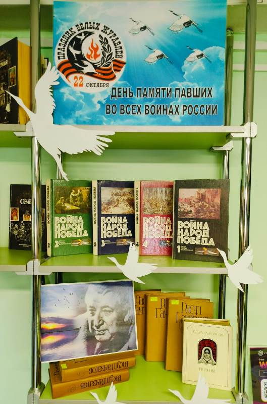 На выставке представлены книги по военной тематике, истории нашей Родины, произведения русских писателей о войне и долге человека перед своим народом, в том числе, стихи Расула Гамзатова. Дополнили экспозицию символами праздника - бумажными журавлями.