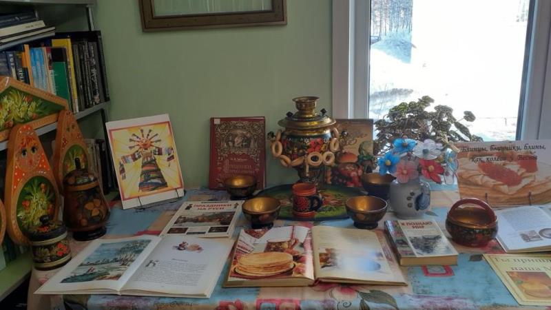 Здесь представлены не только книги о традициях и обычаях русского народа, о народных праздниках, о Масленице, но и самовар с чайником, посуда с русским орнаментом, куклы русские, блины и сушки.