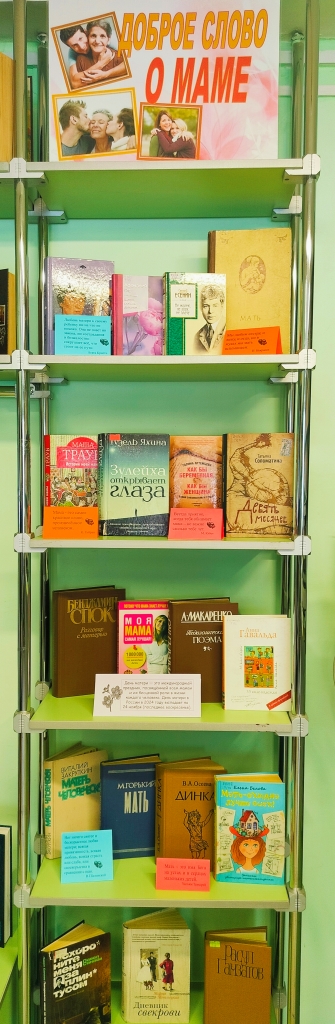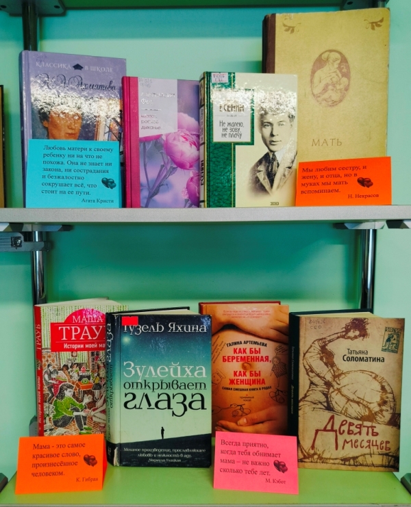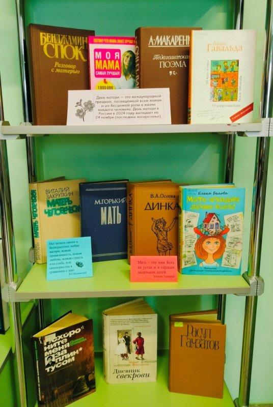 Среди многочисленных праздников, отмечаемых в нашей стране, День матери, который отмечается в 2024 году 24 ноября, занимает особое место. Это праздник, к которому никто не может остаться равнодушным. Он создан, чтобы вспомнить о самом важном человеке, о маме, которая заслуживает внимания каждый день в году. На выставке представлены книги известных поэтов и художественная литература отечественных и зарубежных авторов, которые заставляют взглянуть другими глазами на своих мам, понять какую важную роль они играют в нашей жизни. Так же просмотр дополнен трогательными цитатами великих людей.