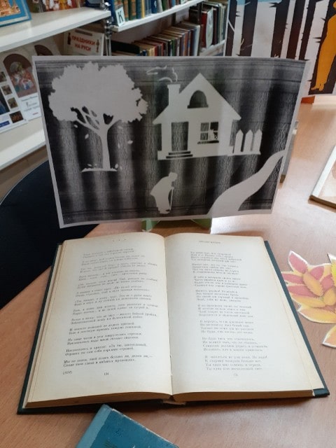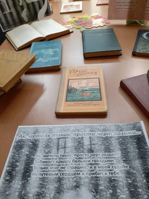 Здесь представлена литература о жизни и творчестве Сергея Есенина, воспоминания современников, сборники его произведений. Любой посетитель может прочитать стихотворения вслух, взяв книгу с выставки. Предлагается читателям проверить свои знания о творчестве поэта, ответив на вопросы теста «Не жалею, не зову, не плачу…». Нужно правильно продолжить 10 стихотворений. А кто правильно ответит на эти вопросы, получит сладкий приз. Приходите, попытайтесь.