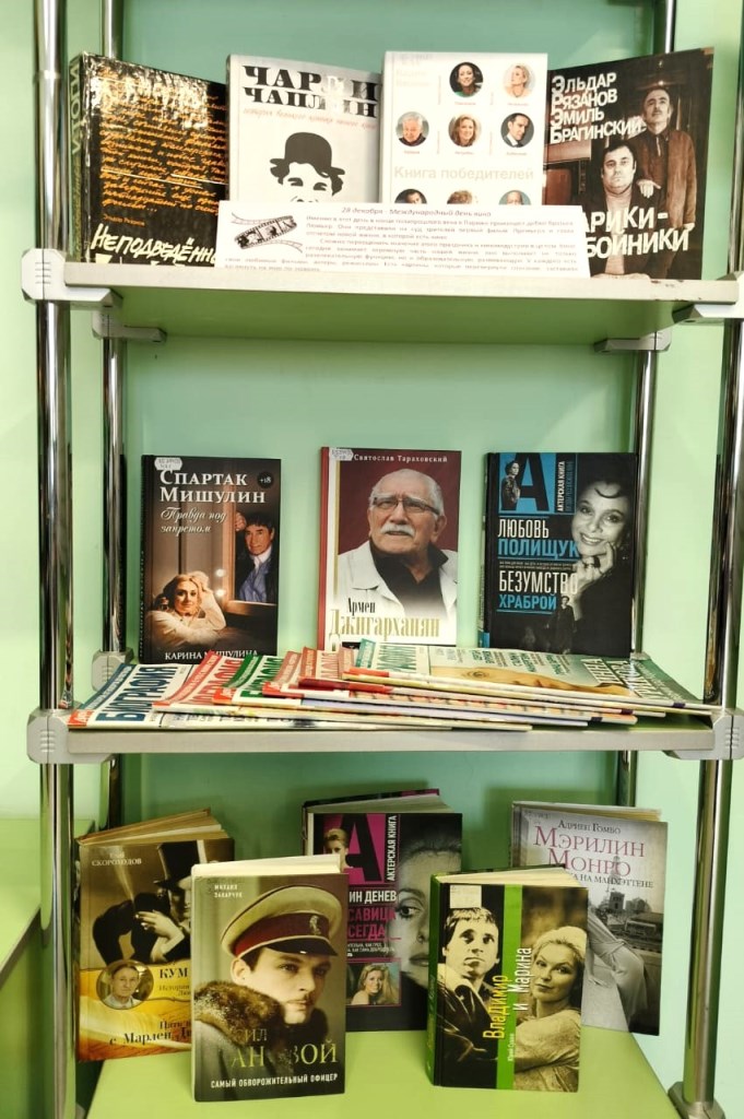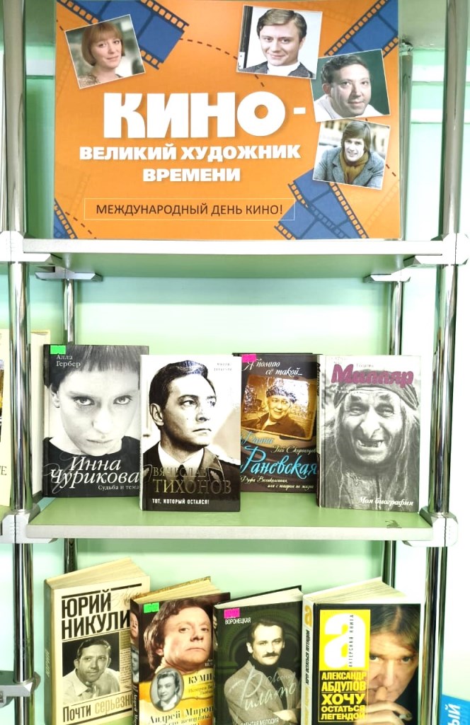 28 декабря – Международный день кино. Кино сегодня занимает огромную часть нашей жизни, оно выполняет не только развлекательную функцию, но и образовательную, развивающую. Большое разнообразие жанров позволяет выбрать именно то, что близко конкретному человеку в тот или иной момент. У каждого есть свои любимые фильмы, актеры, режиссеры. Есть картины, которые перевернули сознание, заставили взглянуть на мир по-новому. На выставке, посвященной этому дню, представлены книги о великих деятелях кино – Ч. Чаплине, Э. Рязанове, А. Миронове, В. Тихонове, А. Абдулове и многих других.