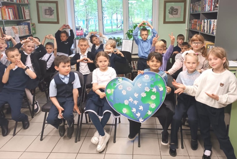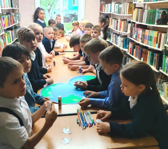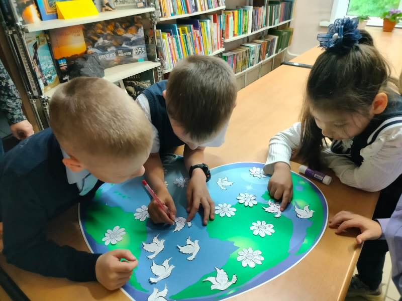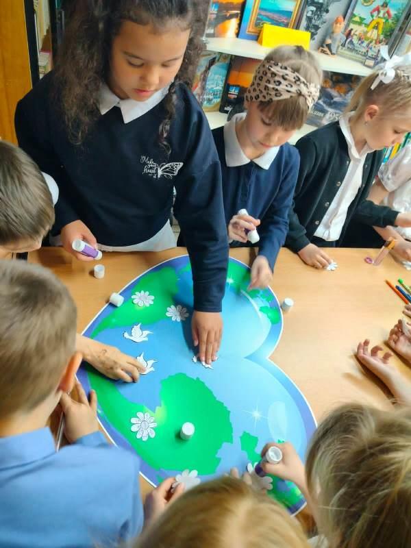 Учащиеся 1 «Д» класса гимназии № 24 на подготовленный плакат с Земным шаром наклеивали символы мира и семьи - ромашки и голубей, но перед этим написали на этих символах пожелания добра, мира дружбы и любви.
