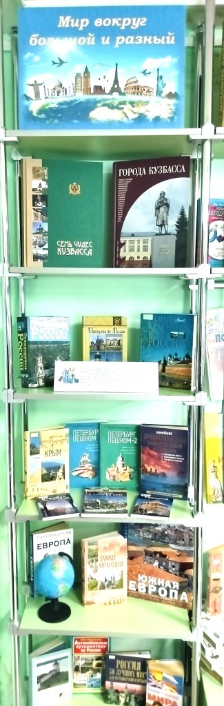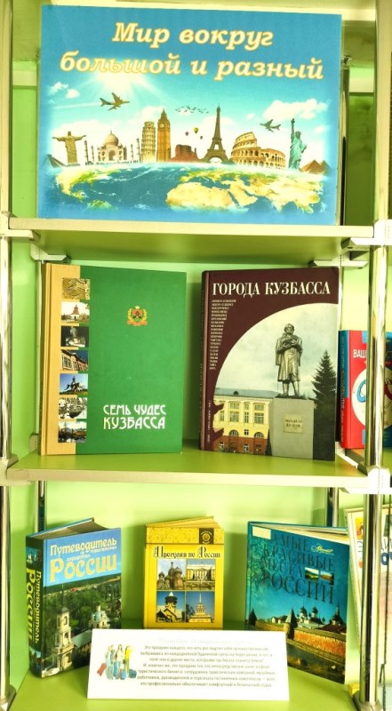 Издания, представленные на выставке, позволят совершить обзорные экскурсии по неповторимым уголкам планеты, также из книг можно получить массу полезной информации о странах, городах, о нравах и привычках населения, о местной кухне, местах отдыха. Данные книги будут интересны не только заядлым путешественникам, но и тем, кто хочет познавать мир, не выходя из дома. Особое внимание уделено на выставке туристическим маршрутам по России и конкретно по городу Междуреченску.