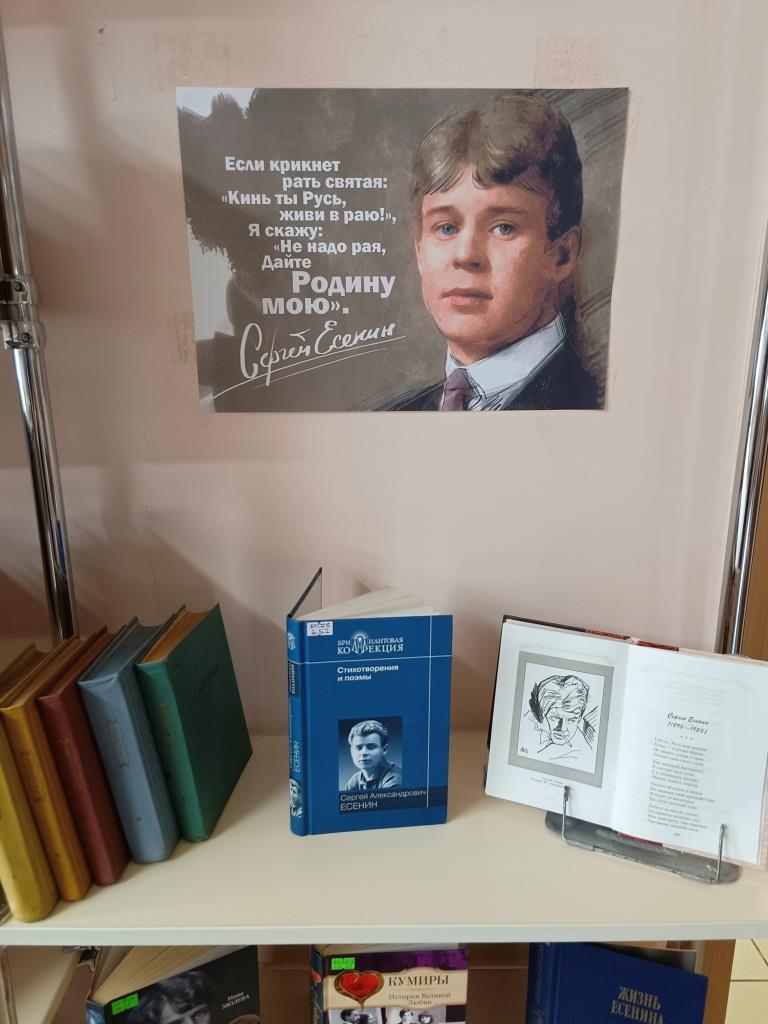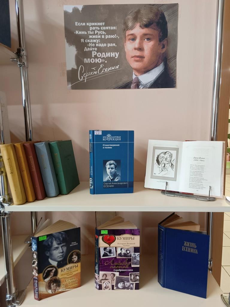3 октября исполняется 130 лет со дня рождения великого русского поэта Сергея Есенина. К памятной дате библиотека подготовила книжную выставку. Творчество С. Есенина всегда будет почитаемо и любимо народом. Его стихи воспитывают чувство красоты, любовь к Родине, призыв к добру. Его емкие и ошеломляюще свежие образы — почти всегда настоящее художественное открытие.