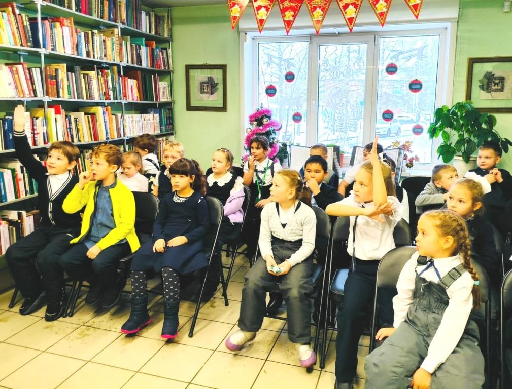 Учащиеся 1 «Е» класса гимназии №24 пришли в библиотеку первый раз, поэтому с ними провели экскурсию, во время которой рассказали, что Библиотека – это удивительный город, где вместо проспектов и улиц – ряды книжных стеллажей, вместо этажей – книжные полки, дома – тома книг, а у каждого дома своё название. И живут в этом чудесном городе друзья читателей – литературные герои. Каждая книга стоит на своём месте. А хорошо ориентироваться в этом удивительном городе помогает библиотекарь. Затем с помощью весёлой викторины «Мульти-Пульти» дети встретились с любимыми героями, вспомнили их крылатые фразы и названия известных анимаций, а подарком стал просмотр мультфильма.