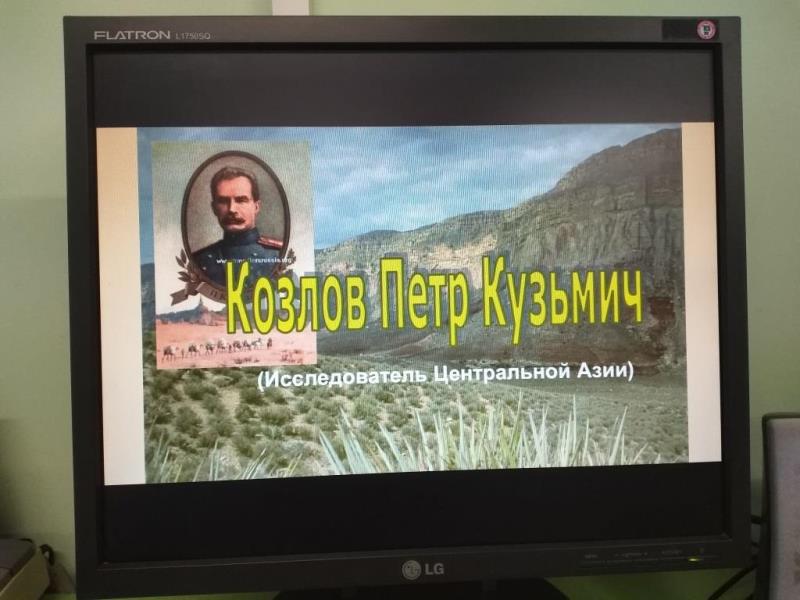 Пенсионеры Дневного пребывания Комплексного Центра Социального обслуживания населения узнали о жизни и деятельности почётного члена Русского географического общества, этнографа, археолога, исследователя П.К. Козлова. 17 лет провёл Пётр Кузьмич в экспедициях по Центральной Азии, предпринял шесть длительных экспедиций в Нань-Шань, Сычуань, Восточный Туркестан, Монголию и Тибет. Он автор около 70 научных работ, первооткрыватель мёртвого тангутского города Хара-Хото, ученик, последователь и один из первых биографов Н.М. Пржевальского. В своих экспедициях исследователь Азии не раз сталкивался со смертельной опасностью, что, в общем, вполне объяснимо, учитывая, до какой степени научные исследования зачастую сливались с военной разведкой. На мероприятии демонстрировались слайды с фотографиями и отрывки из документальных фильмов о жизни Петра Козлова.