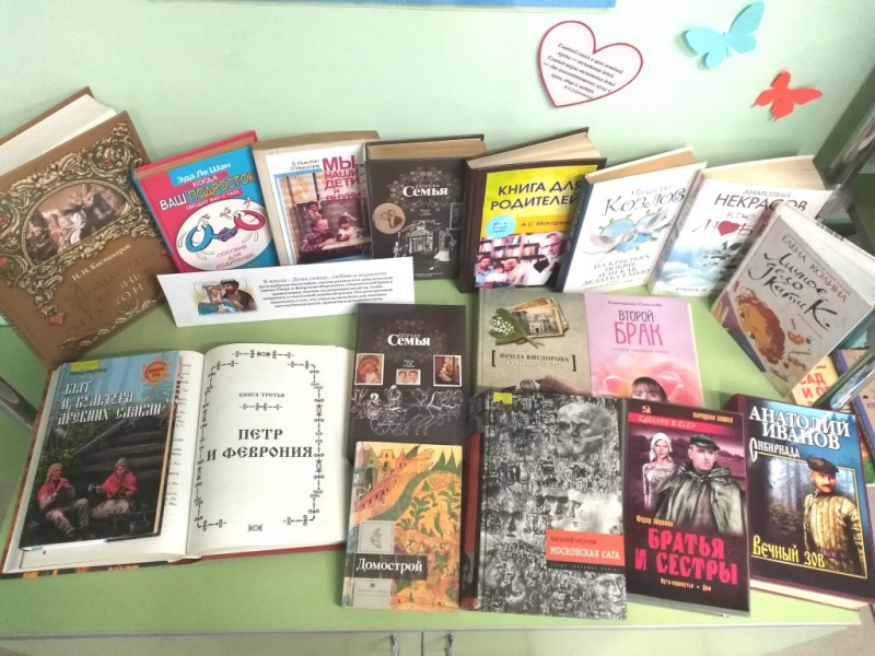 Из материалов выставки можно узнать, почему Петра и Февронию считают покровителями супружества и семейного благополучия. Их история убеждает, что любовь и верность являются главной жизненной ценностью для человека и создания крепких семейных уз. На выставке представлена популярная литература по психологии и педагогике семейных отношений, о воспитании подрастающего поколения, о древних русских семейных традициях, о проблемах семьи и методах их решения, о секретах создания гармоничных отношений в семье. Художественные произведения известных авторов познакомят с вечной проблемой отцов и детей, братьев и сестёр, невесток и свекровей.