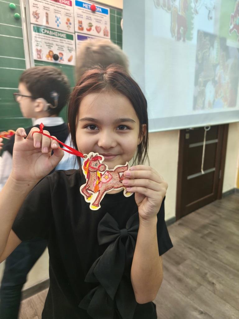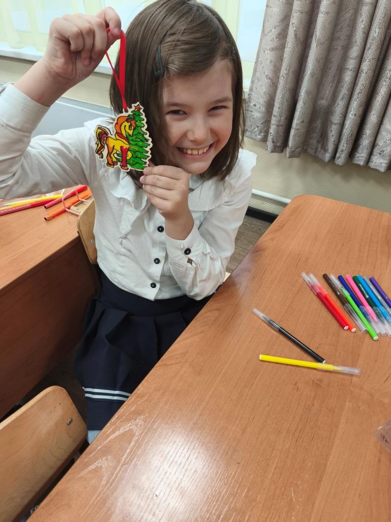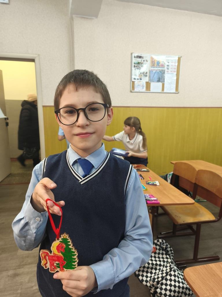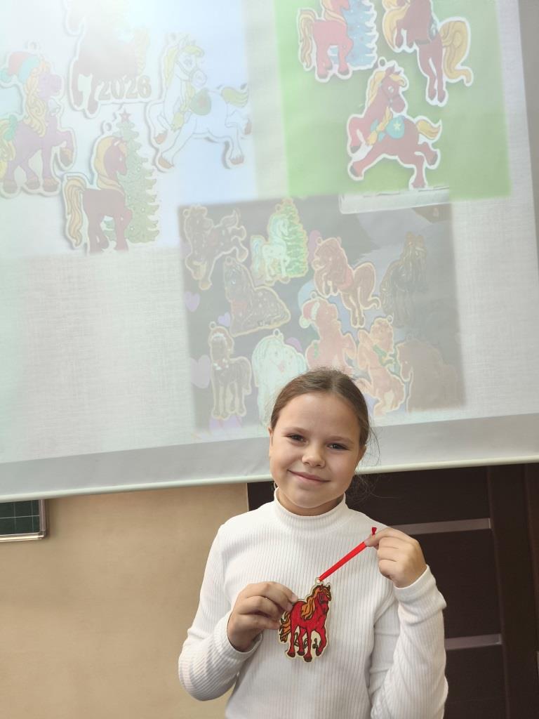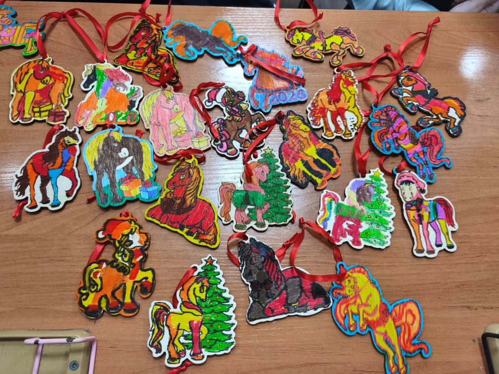 В начале учащимся рассказали о том, когда и кем была введена традиция отмечать Новый год в ночь с 31 декабря на 1 января, какие существуют обычаи и приметы, как менялся внешний вид праздничных украшений с течением времени. Также ребятам рассказали, что 2026 год по восточному календарю – год Красной Огненной Лошади, и чем он будет особенным. Окунувшись в атмосферу предновогодней сказки, мальчишки и девчонки принялись раскрашивать деревянных лошадок. Красный, желтый и оранжевый цвета стали основными, так как они символизируют стихию огня и энергию года Лошади. Каждая лошадка получилась по-своему уникальной: яркой, нарядной и полной новогоднего очарования.