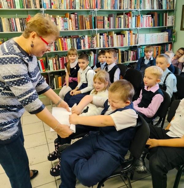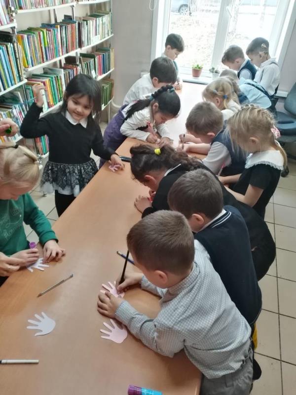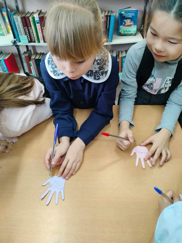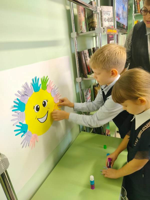 В ходе мероприятия библиотекарь рассказала учащимся 1-х классов гимназии №24 об истории возникновения праздника. Ребята узнали, что в память о патриотической деятельности Минина и Пожарского на Красной площади в Москве установлен памятник, на котором выбита надпись: «Гражданину Минину и князю Пожарскому благодарная Россия». А о том, как важно быть дружными и сплочёнными, показал практический опыт, когда дети пытались разорвать стопку бумаги – не получилось, а по одному листочку легко порвали. Демонстрировался мультфильм о единстве. Затем дети приняли участие в квилте – наклеивали разноцветные ладошки с пожеланиями на заранее подготовленное Солнышко.
