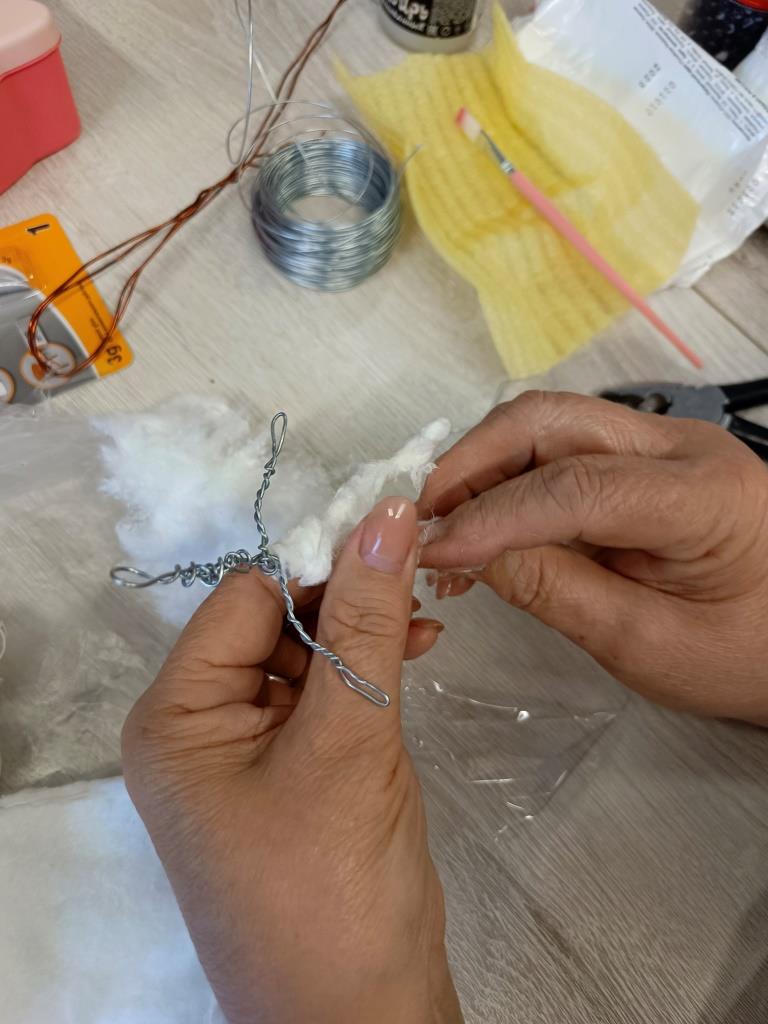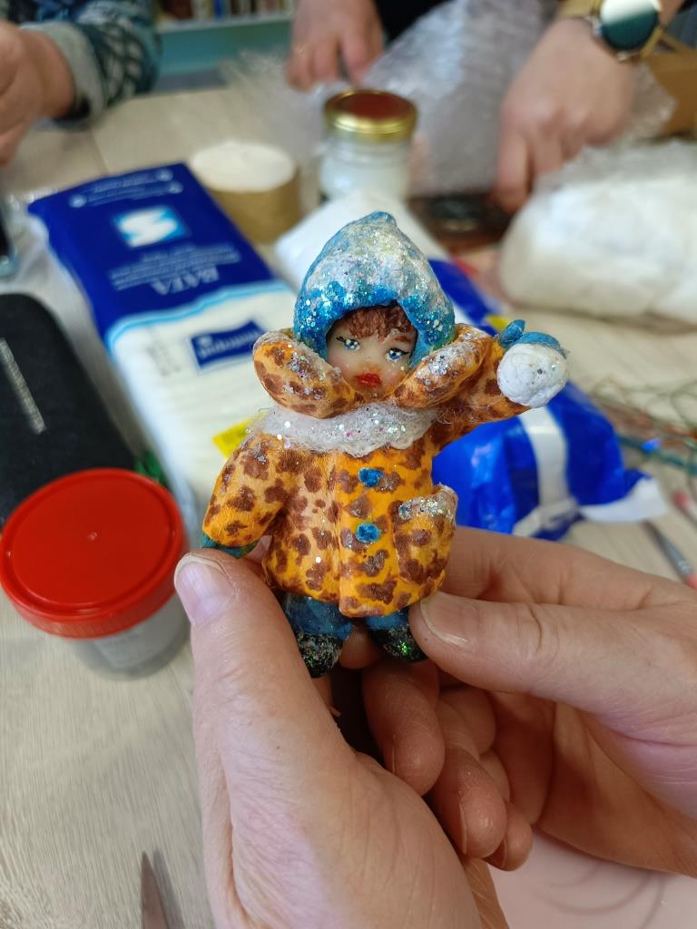 Каждая ватная игрушка проходит несколько этапов создания: формирование каркаса из проволоки, послойное наложение ваты с клейстером, сушка, роспись акриловыми красками и финальное покрытие. Своим мастерством поделилась с присутствующими Эльвира Викторовна Бажева. Наши рукодельницы вложили в каждую игрушку частичку своего тепла, внимательно повторяя за опытным мастером каждое движение, но при этом не забывая об индивидуальности. Поэтому каждая игрушка в итоге получилась уникальной. Она отражает не только видение мастера, но и его настроение.