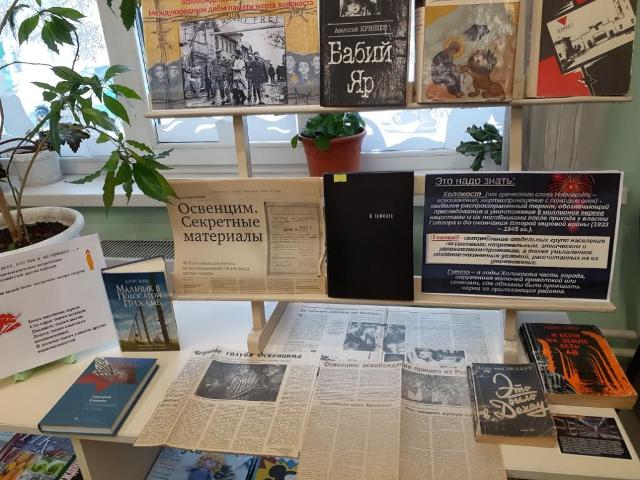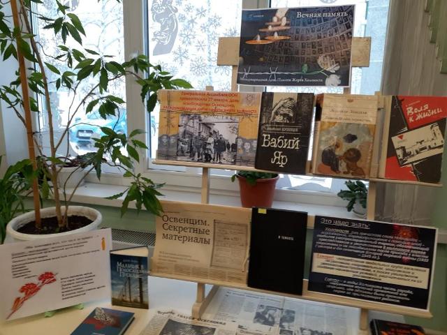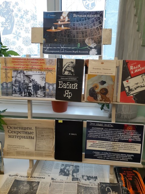 Вот об этом и рассказывает выставка «Вечная память». Здесь представлено совсем немного книг о лагерях смерти, о гетто, о стойкости и несгибаемой воле патриотов в фашистской неволе, но какие…. Это и «Бабий яр» Анатолия Кузнецова, и «Воля к жизни» Виктора Павленко, и «Даниэль Штайн, переводчик» Людмилы Улицкой, и «Мальчик в полосатой пижаме» Джона Бойна».