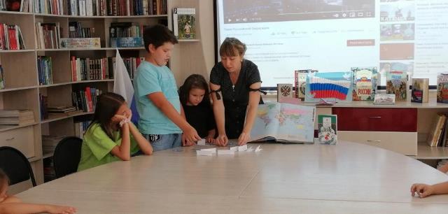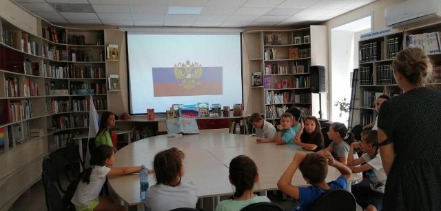 Исторический час ко Дню Государственного флага был проведен в Модельной городской детской библиотеке 20 августа для детей, посещающих пришкольный лагерь музыкальной школы № 24.