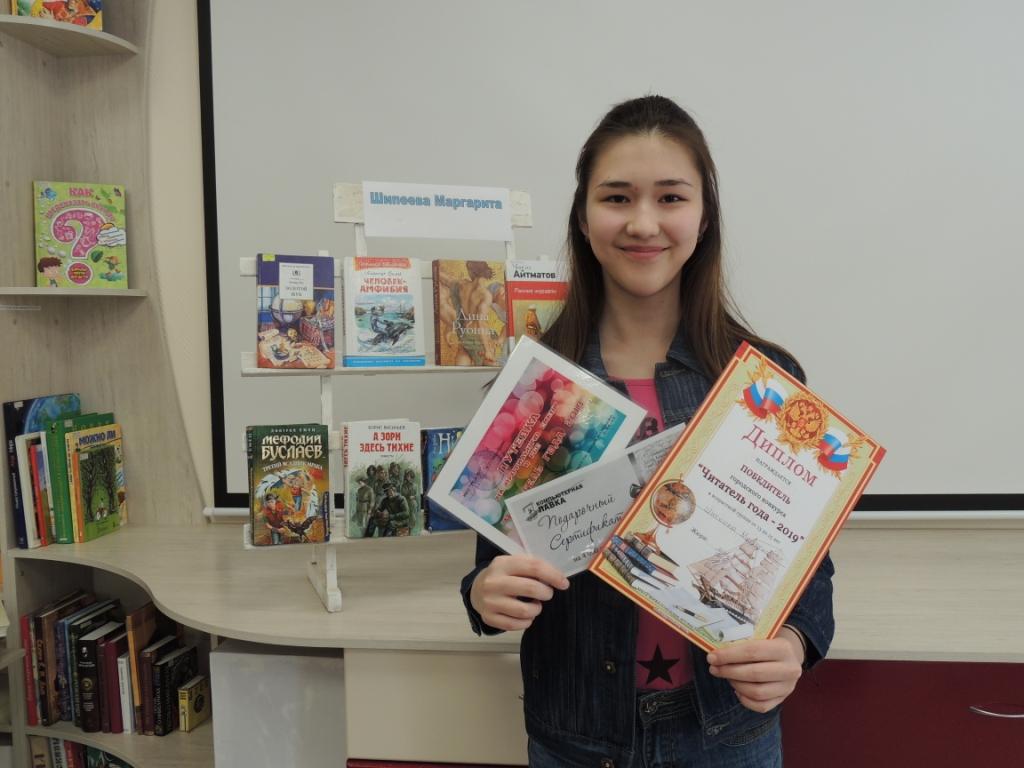 Победителем конкурса стала Шипеева Маргарита, читательница Городской детской библиотеки. Ей присвоено звание «Читатель года – 2019». Маргарита награждена путевкой на Межрегиональную смену актива детских молодежных организаций «Республика Беспокойных сердец», которую предоставил Отдел по делам молодёжи Управления культуры и молодёжной политики города и сертификатом на покупку товара в магазине «Компьютерная лавка». Всех участников конкурса наградили грамотами и памятными подарками.