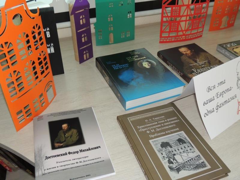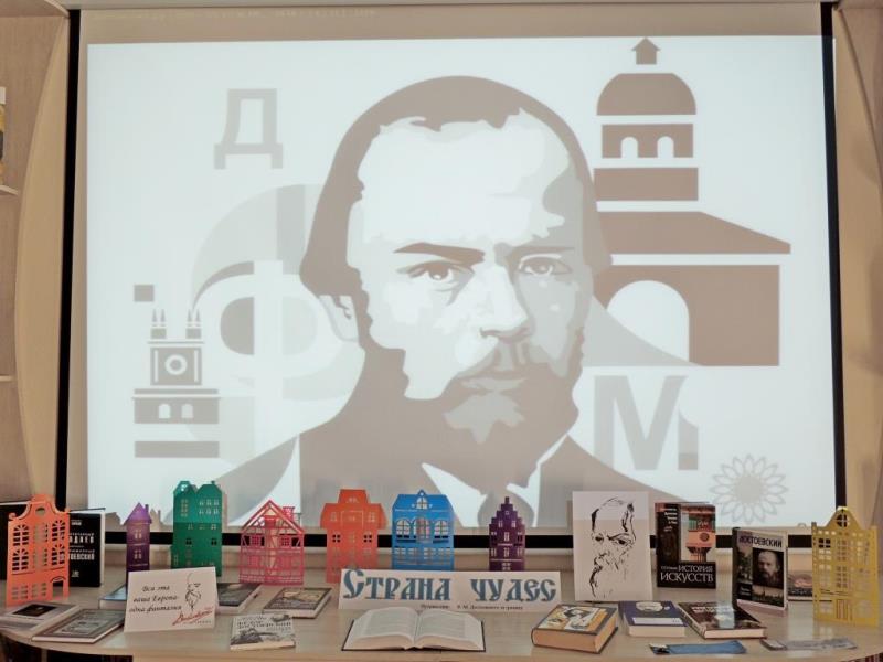Формат книжной выставки «Писатель на все времена» необычный, выставка оформлена в оконном пространстве в силуэтном изображении, она доступна жителям и гостям нашего города. На другой книжной выставке «Путешествие в страну чудес» представлены книги, в которых отображены факты биографии, посвященные периоду жизни и творчества писателя за границей. Выставки сопровождаются иллюстрациями к произведениям, слайд-презентацией, фрагментами экранизаций произведений автора, аудио чтением отрывков из произведений Ф. Достоевского, викториной, кроссвордами «Герои Достоевского». К юбилею писателя библиографом библиотеки подготовлены библиографический указатель литературы «Достоевский Фёдор Михайлович» и книжные закладки с цитатами из великих произведений писателя, которые также расположились на выставках.