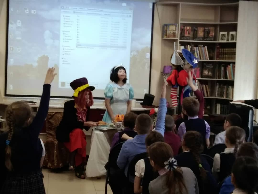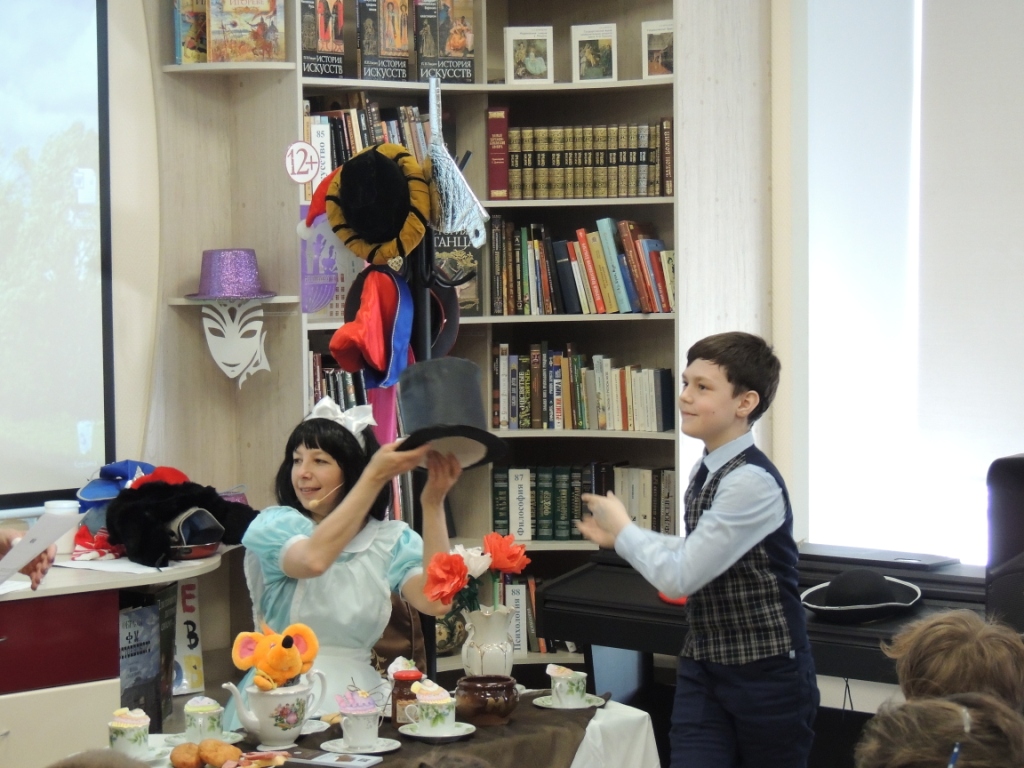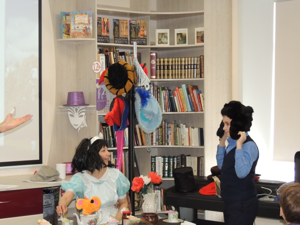 Вместе с героями сказки Льюиса Кэрролла «Алиса в стране чудес», Алисой и Шляпником, ребята по головным уборам угадывали, кому из героев сказок они принадлежат, разгадывали ребусы, участвовали в играх «Книжные фокусы», «Угадай сказку», а в танце «Буги-вуги» разминались под музыку. Активно, с большим интересом дети провели время в библиотеке.