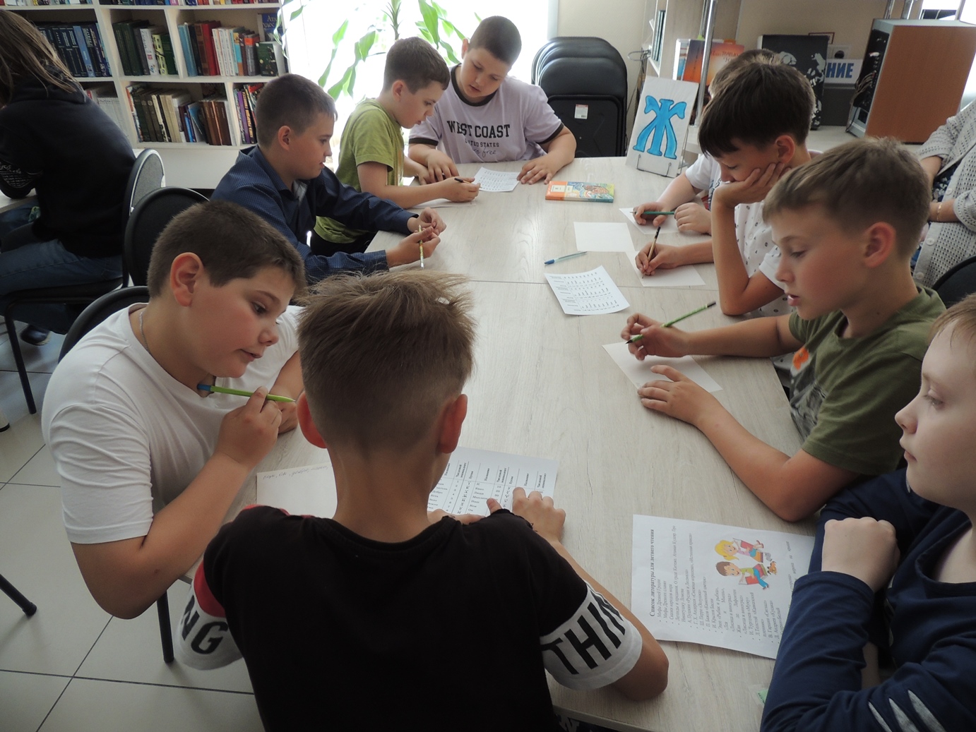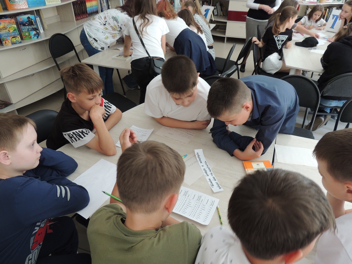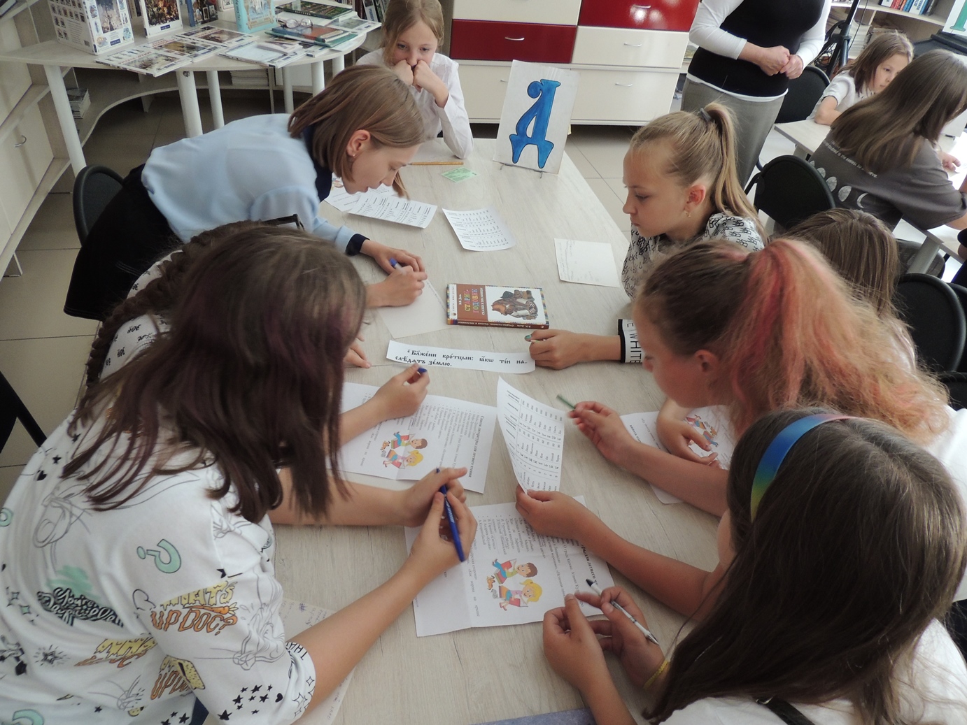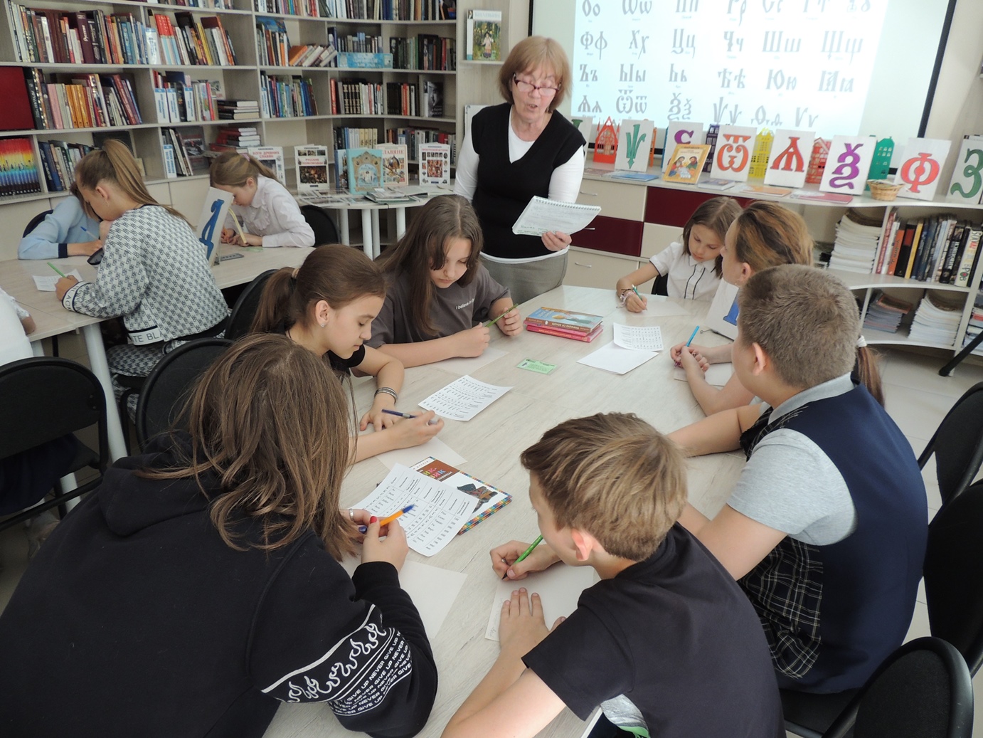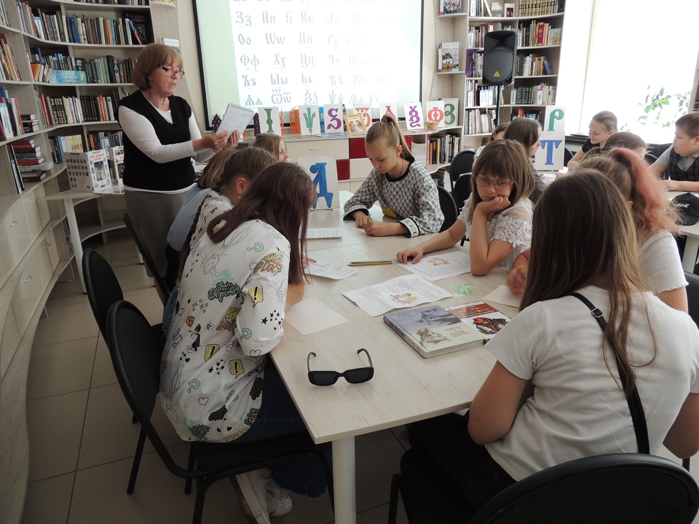 Встреча в стенах библиотеки состоялась в форме уроков в древнерусской школе и называлась «В старину учились дети». Ребята стали учениками уроков азбуки, математики, словесности. Дети удивились, что в азбуке было 49 букв, затем 46 и сегодня мы имеем 33 буквы алфавита, а в математике цифры обозначались буквами. Урок же словесности стал для ребят уроком нравственности, в основе которого священное писание. Этот урок библиотекарь провёл на примере произведения Л.Н. Толстого «У Васи было четыре копейки». Дети активно участвовали во всех заданиях, предложенных библиотекарем. Весёлая переменка наполнилась считалочками, загадками и игрой «Колечко».