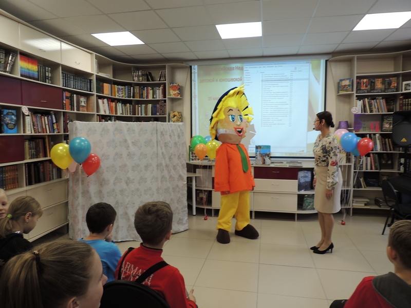 Читатели совместно с библиотекарем отправились в увлекательное путешествие по Миру книг: помогли Буратино собрать книгу сказок, которую он потерял по дороге. В этом ему помогали, как ни странно, Лиса Алиса и Кот Базилио. Весело были встречены и другие книжные герои – Незнайка, Чебурашка и Красная Шапочка. Дети активно отгадывали загадки и дружно играли в подвижные игры, а за правильные ответы литературные герои возвращали пропавшие произведения в книгу сказок и раздавали жетоны, которые в конце "Недели" дети смогут обменять на призы. Поздравить всех пришла и Королева Книг, поблагодарила присутствующих за прекрасный праздник и, как принято на именинах, угостила всех сладким пирогом.