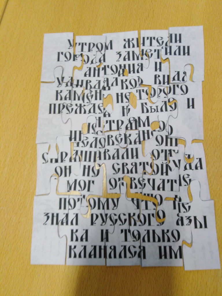 Участникам было предложено несколько заданий. Поучаствовать в «археологических раскопках» – по найденным «артефактам» (кусочкам бересты) составить текст письма и узнать, о чем писали новгородцы. Побывать в древнерусской школе: на уроке математики решить примеры, используя числовые значения букв; на уроке словесности рассказать отрывок из жития Антония Римлянина; на уроке чтения – прочесть молитву на церковно-славянском языке; на уроке письма дошкольники показали свое мастерство не только в имитации изготовления деревянных тетрадок, но и умении писать и рисовать на них.