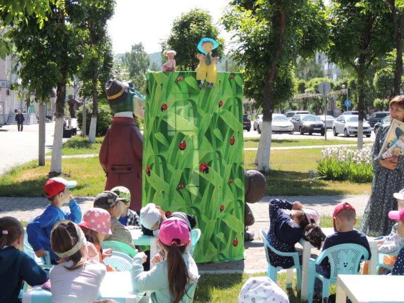 13 июня – в День божьих коровок, на площадке у библиотеки для все желающих библиотекари провели обзор познавательных книг, громкие чтения произведений про насекомых, мастер-класс «Божья коровка» из природных материалов и показали спектакль кукольного театра. А 15 июня для воспитанников МБДОУ №13 «Солнышко», читателей библиотеки и горожан прошел праздник «Незнайка в гостях у ребят». Малыши отвечали на вопросы викторины по сказке «Незнайка в Солнечном городе» Николая Носова, познакомились с другими сказками о Незнайке и его друзьях, рисовали героев на асфальте, играли в подвижные игры. Сюрпризом стало появление на празднике Незнайки – ростовой куклы. С ним ребята танцевали веселый танцы, пели песню «В траве сидел кузнечик» и, конечно, фотографировались.