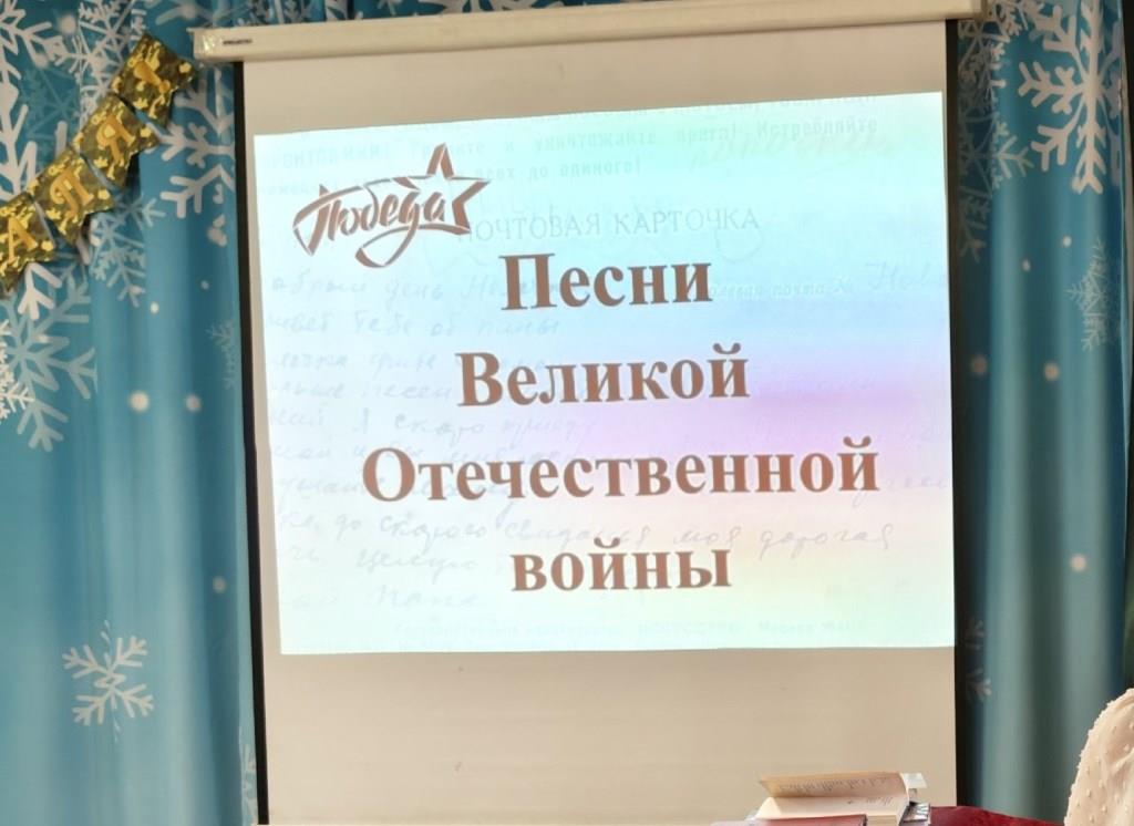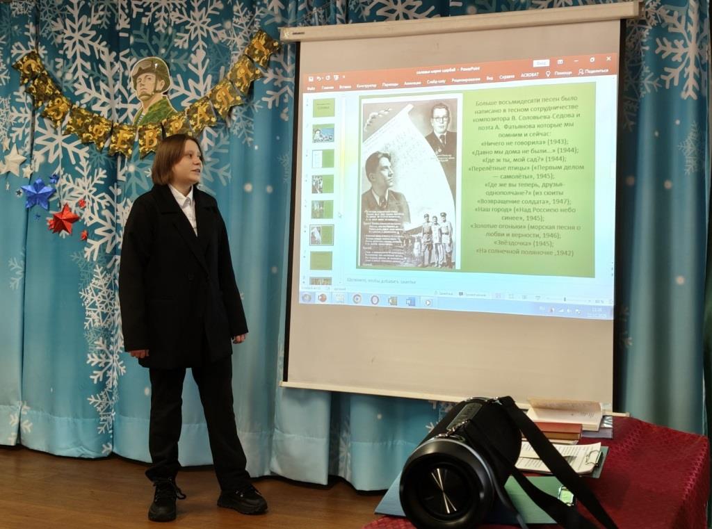 Дети представили исследовательские работы о песне военных лет, которые они получены заранее, рассказав историю создания. На встрече звучало живое исполнение песен под гитару, были показаны фрагменты из художественных и документальных фильмов. Никто не остался равнодушным – знакомые с детства песни не только пели всем залом, но и со слезами на глазах переживали события тех времен.